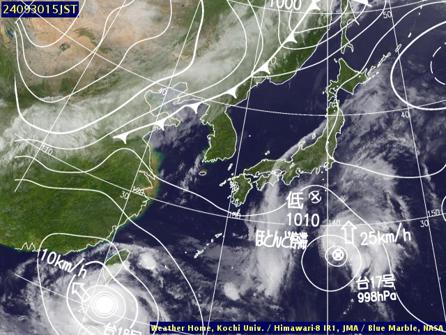 | 地上(高知大学気象情報頁赤外画像と気象庁速報天気図を合成) | |||