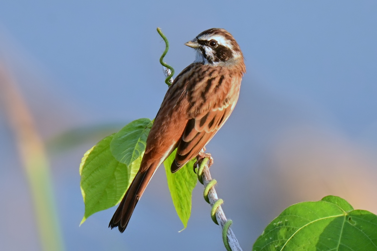 青空を写した川面を背景に、ツルをまいた草に留まったホオジロ(オス)。