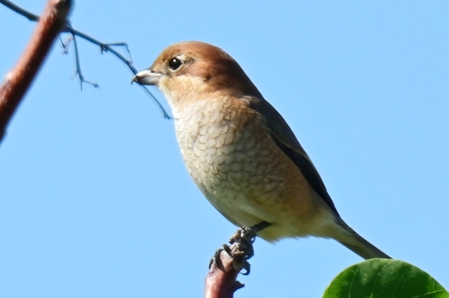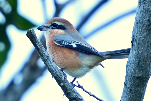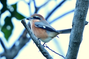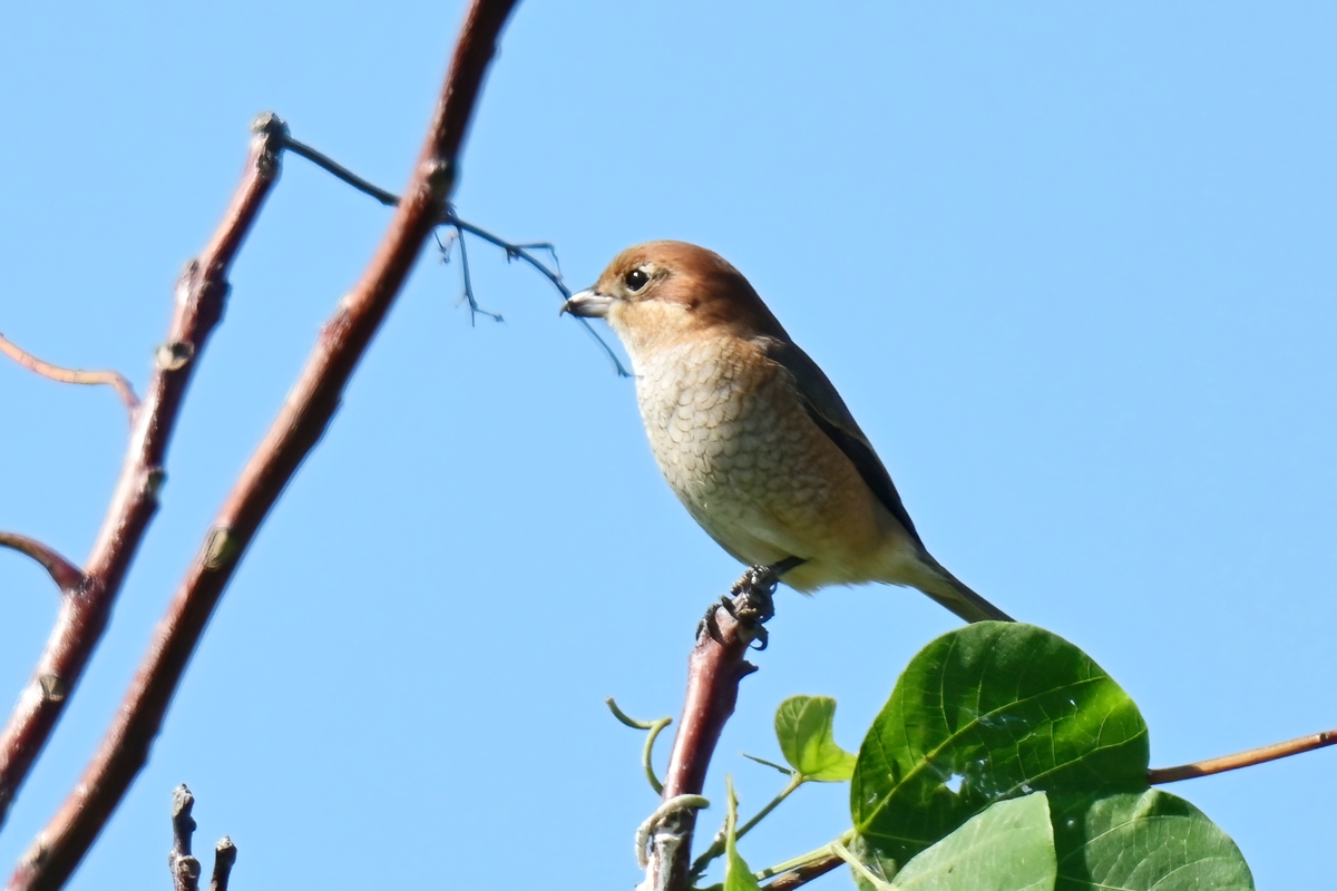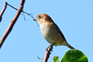 100m離れた樹木にあいついで留まったモズのオスとメス。
