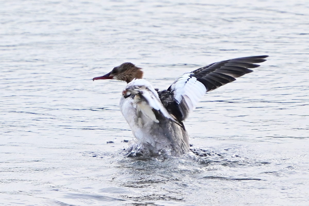 | 夕方の員弁川。 川岸の樹木にはモズ(オス)。カワアイサ(メス)は今日はめずらしく1羽。 カワセミの気配がないこの頃で、昨年の冬によく留まったポイントを 張ってみると、日没のころにやってきて留まり、すぐに飛び去りました。 明日以降、この場所に重点をおいてみたいところ。 |