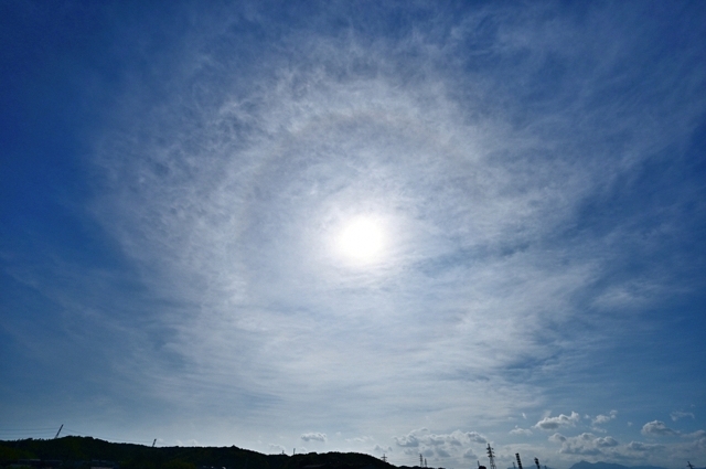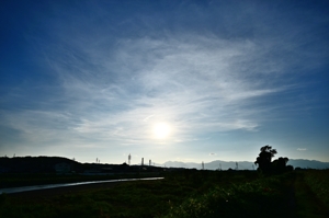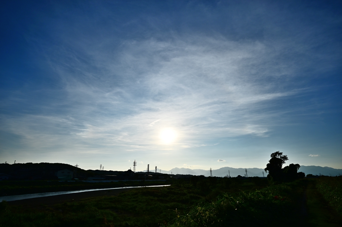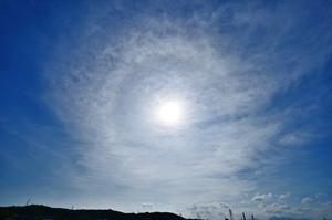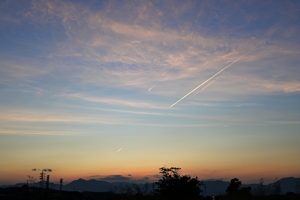 関東沖に達した台風17号の縁辺のものと思われる巻層雲に 22°ハロや淡い幻日が見られました。日没後は上層に届く 赤い光で、ピンク色の巻層雲や赤い飛行機雲がたくさん。 |