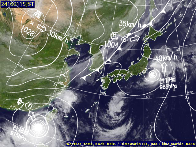 | 地上(高知大学気象情報頁赤外画像と気象庁速報天気図を合成) | |||