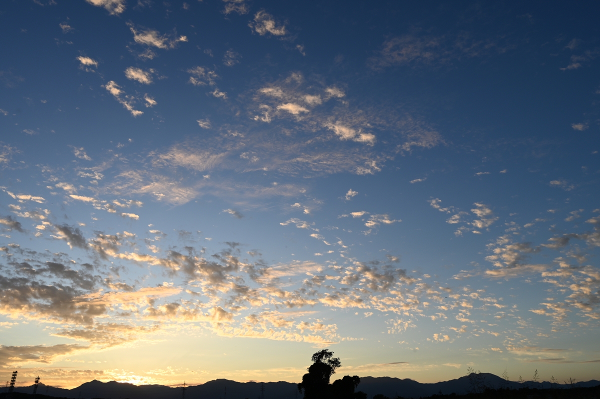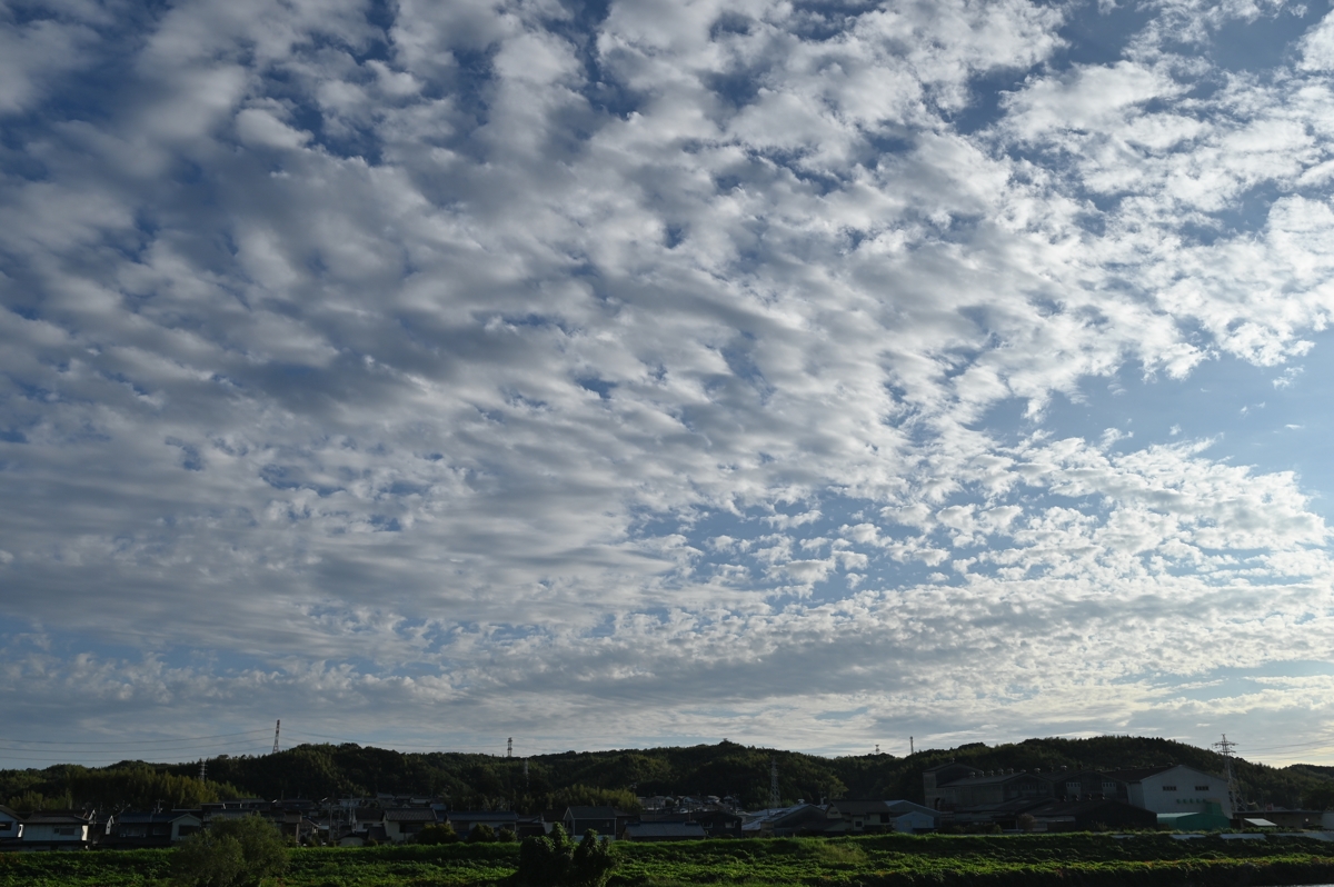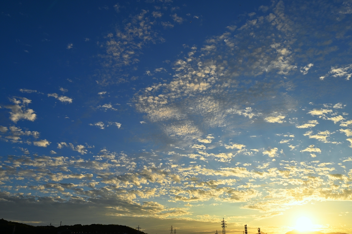 | 秋雨前線が南に離れ、秋の空気感が漂います。 空には高積雲や巻積雲が生まれては消えてゆきます。 一方で、東の遠方にはまだ夏の名残を思わせるような 積乱雲。静岡県遠江方面のもののようです。 (浜松では、前1時間降水量が、19時に48.0mm、 20時に53.5mm。土砂災害警戒情報も出されました。) |