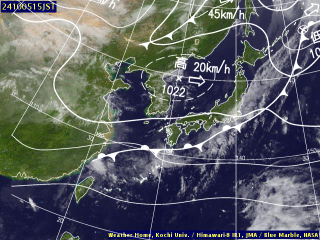 | 地上(高知大学気象情報頁赤外画像と気象庁速報天気図を合成) | |||