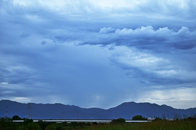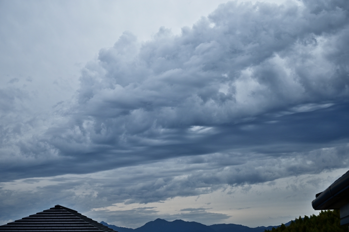 南岸に長く延びる停滞前線。 この北側で、上層・中層・下層の雲が重なる空でした。 夕方には山麓に雲底の起伏のはげしい雲ができてきて、 その後、シルエットになった尾流雲や降水雲が見られました。 |