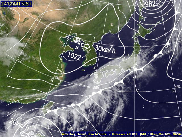 | 地上(高知大学気象情報頁赤外画像と気象庁速報天気図を合成) | |||