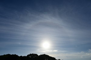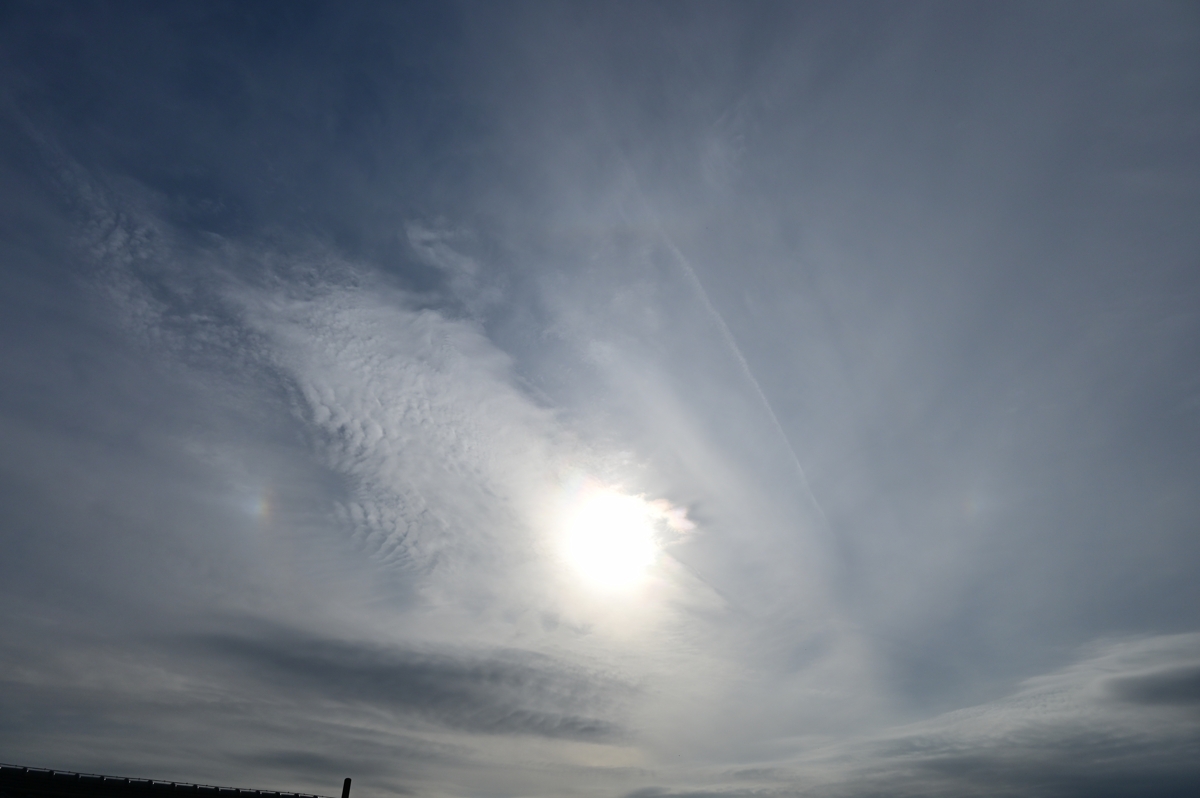前線は大きく南下するも、ジェット気流の影響で上層雲。 日の出からまもなく、明るい幻日。その後、22°ハロも。 昼頃、西の空に雲底がはげしく複雑にうねった荒底雲。 午後には、再び幻日と、かなり明るい環天頂アーク。 タンジェントアークも見えていました。 |