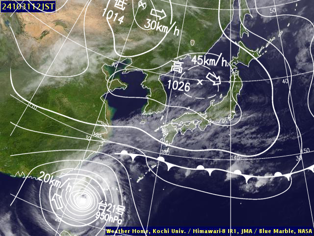 | 地上(高知大学気象情報頁赤外画像と気象庁速報天気図を合成) | |||