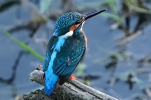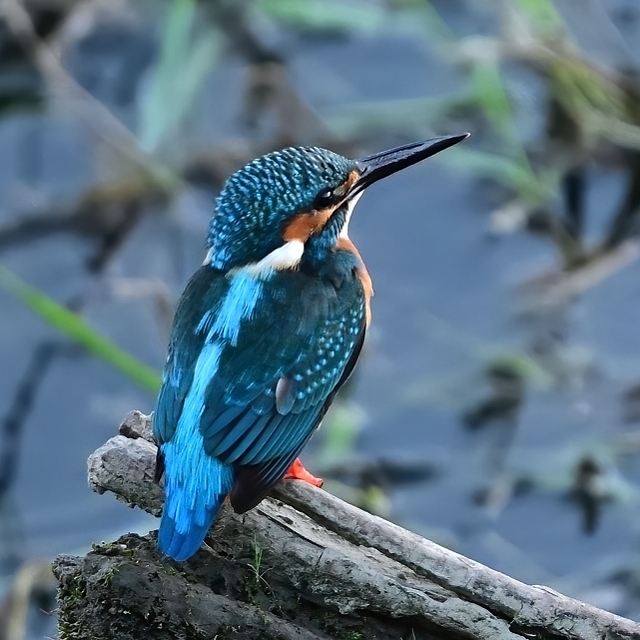 斜め後ろからの俯瞰で見る、陽が翳ってからのカワセミの姿です。