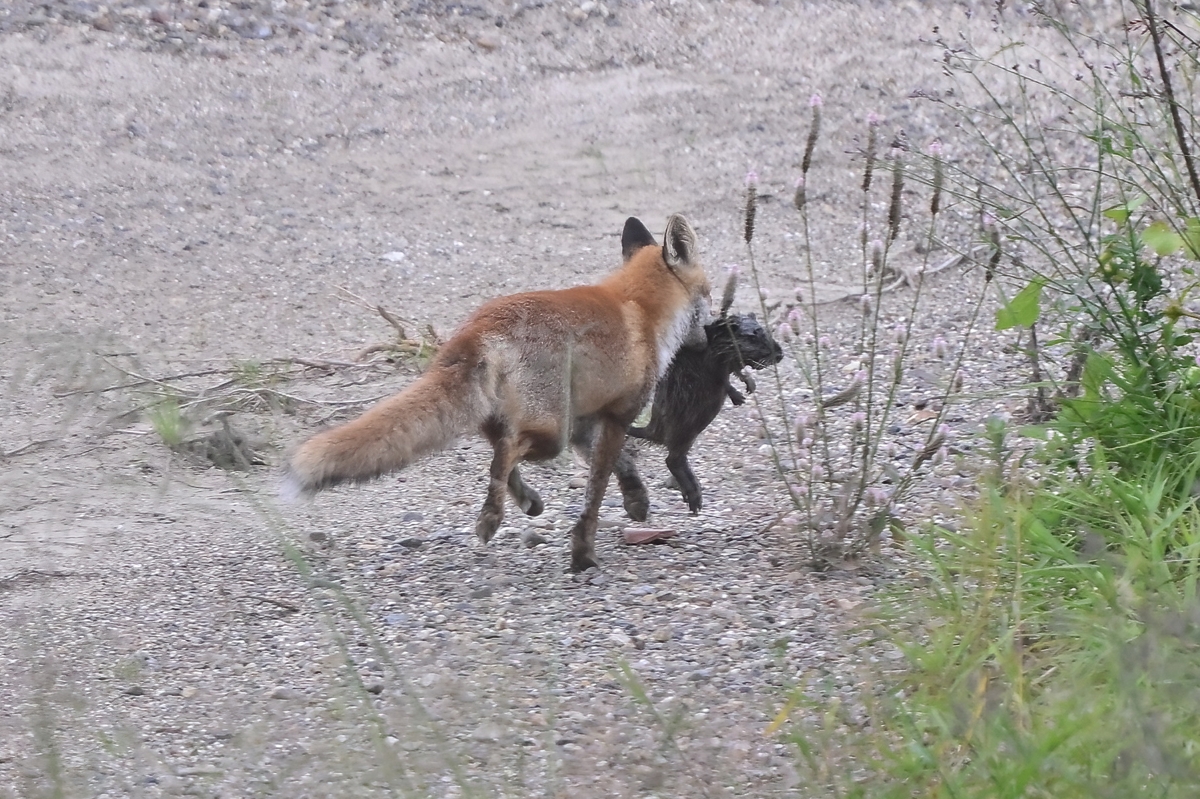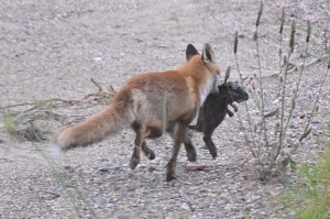 | ホンドキツネ くわえているのは子ではなく、 ヌートリアっぽい。 |