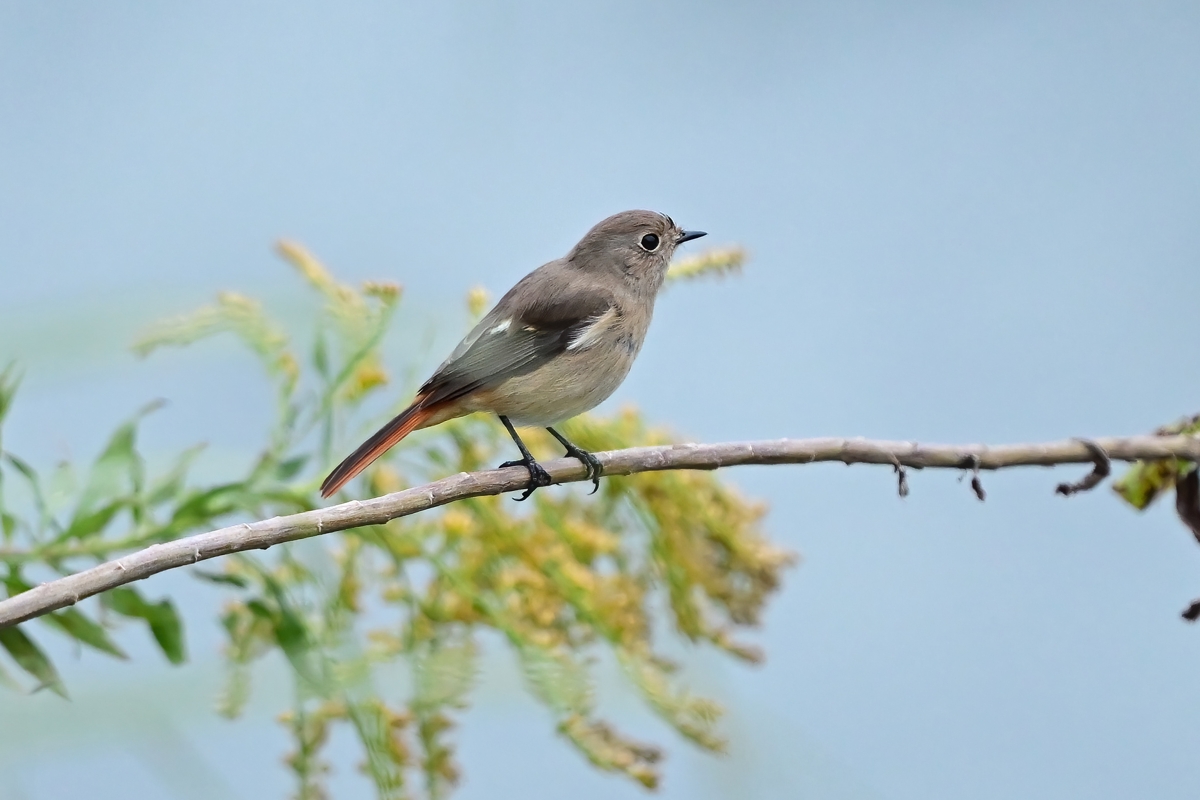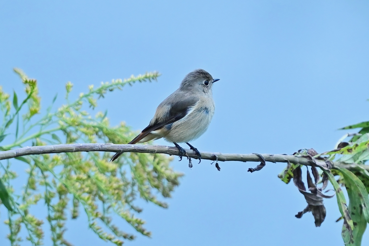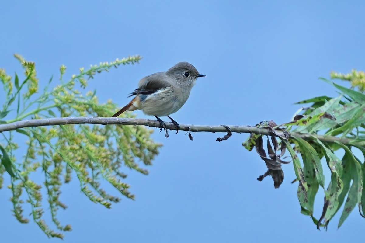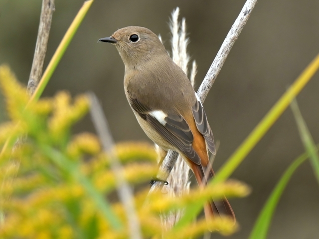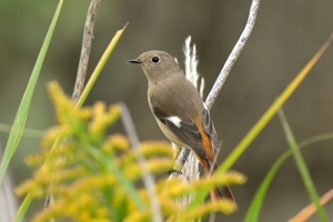 | ジョウビタキ(メス) 前景にはセイタカアワダチソウ。 |