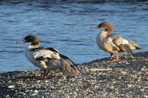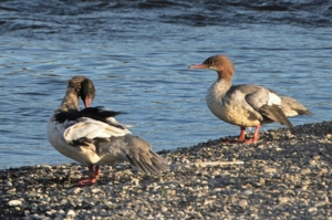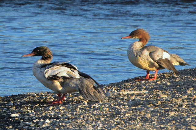 中州に2羽のカワアイサが休息。羽根が乱れていましたが、