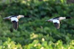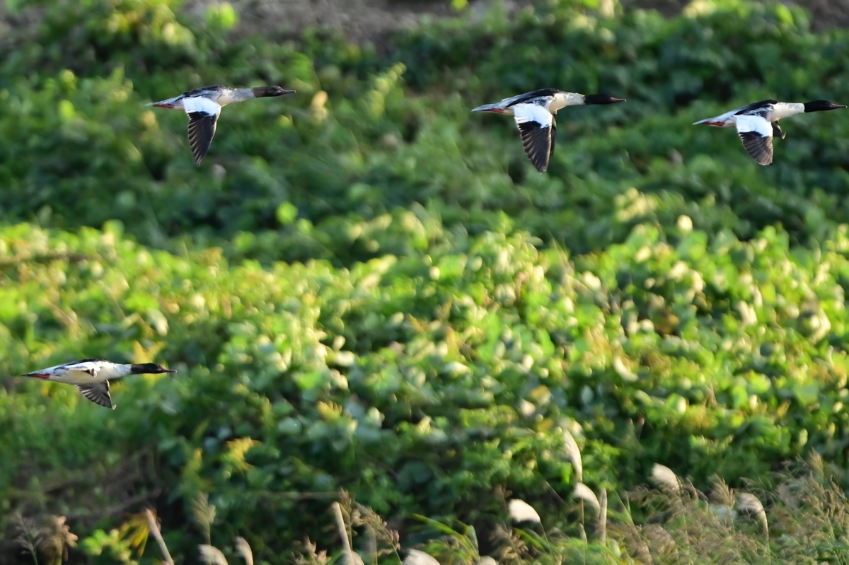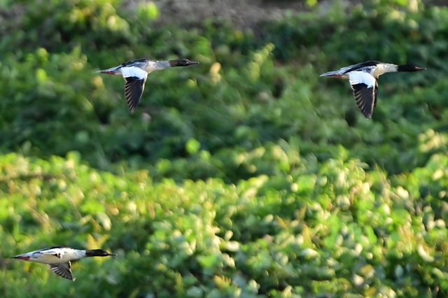 対岸を上流に向かって飛ぶ、カワアイサの群れ。