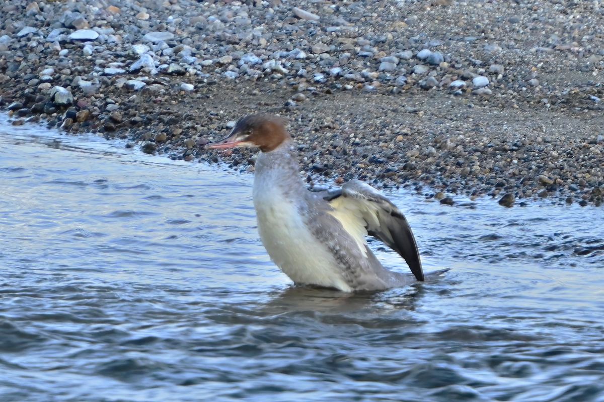 | 夕方の員弁川。 日没前に、オス・メス併せて5羽ほどのカワアイサが下流から 泳いできました。浅瀬になった場所で顔を水面につけながら 猛スピードでラッシュして鮎らしき魚を捕らえる激しいシーン が見られました。オスとメスが魚を受け渡すのか、争って いるのか、どちらだろうというシーンも。 |