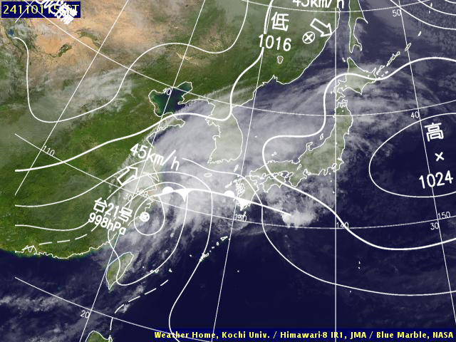 | 地上(高知大学気象情報頁赤外画像と気象庁速報天気図を合成) | |||