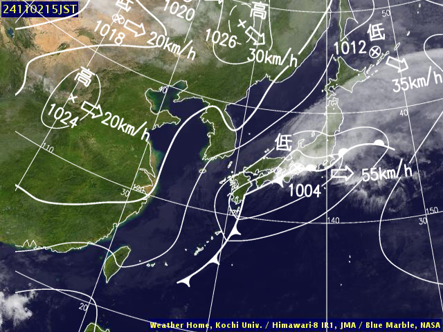 | 地上(高知大学気象情報頁赤外画像と気象庁速報天気図を合成) | |||
