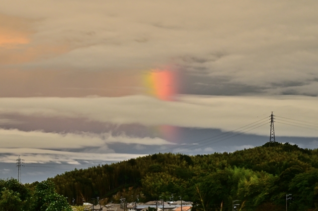夕方、寒冷前線が通過して日が差し込むと同時に天気雨が降り、 明るい虹があらわれました。虹の内側には反薄明光線も見られ、 虹の中心と反薄明光線の収束点はどちらも同じ、対日点です。 自然のなかに生まれた幾何学的な風景。科学的で神秘的です。 全天のあちらこちらに乳房雲が生じていたのもこの時間帯の 空の特徴。天気雨が降るのもこうした空のためのようでした。 また、日没の数分前には夕焼けの太陽光で赤色が残った 赤虹が下層雲に隠されて短く見られました。赤虹の株虹です。 (「赤カブ虹」といいたくなりそう・・・・) |