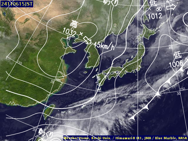 | 地上(高知大学気象情報頁赤外画像と気象庁速報天気図を合成) | |||
