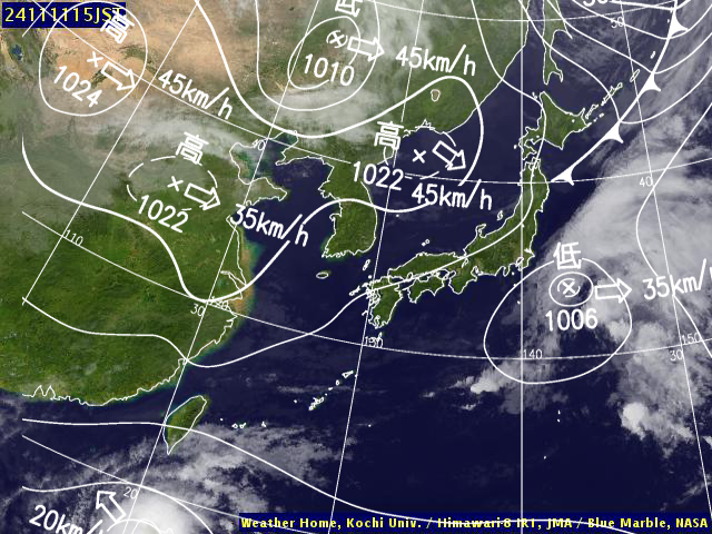 | 地上(高知大学気象情報頁赤外画像と気象庁速報天気図を合成) | |||