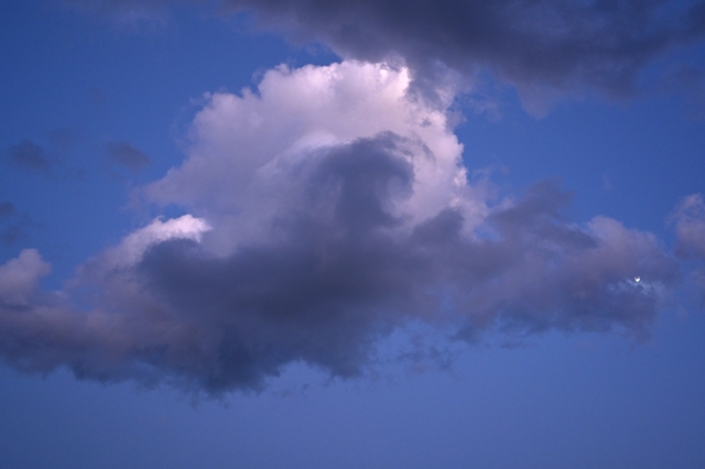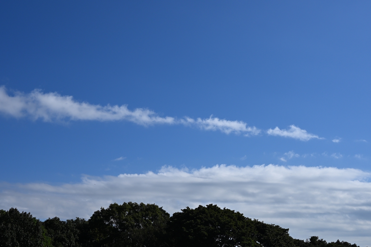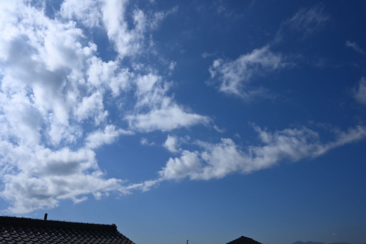 快晴の空に、輪郭の毛羽立った積雲が多数。 直線状に残る細い雲も多く見られました。 夕方は山麓に積雲や層積雲。平野部でもときどき積雲が 並雲にまで発達。写真は頭上で大きくなった並雲です。 |