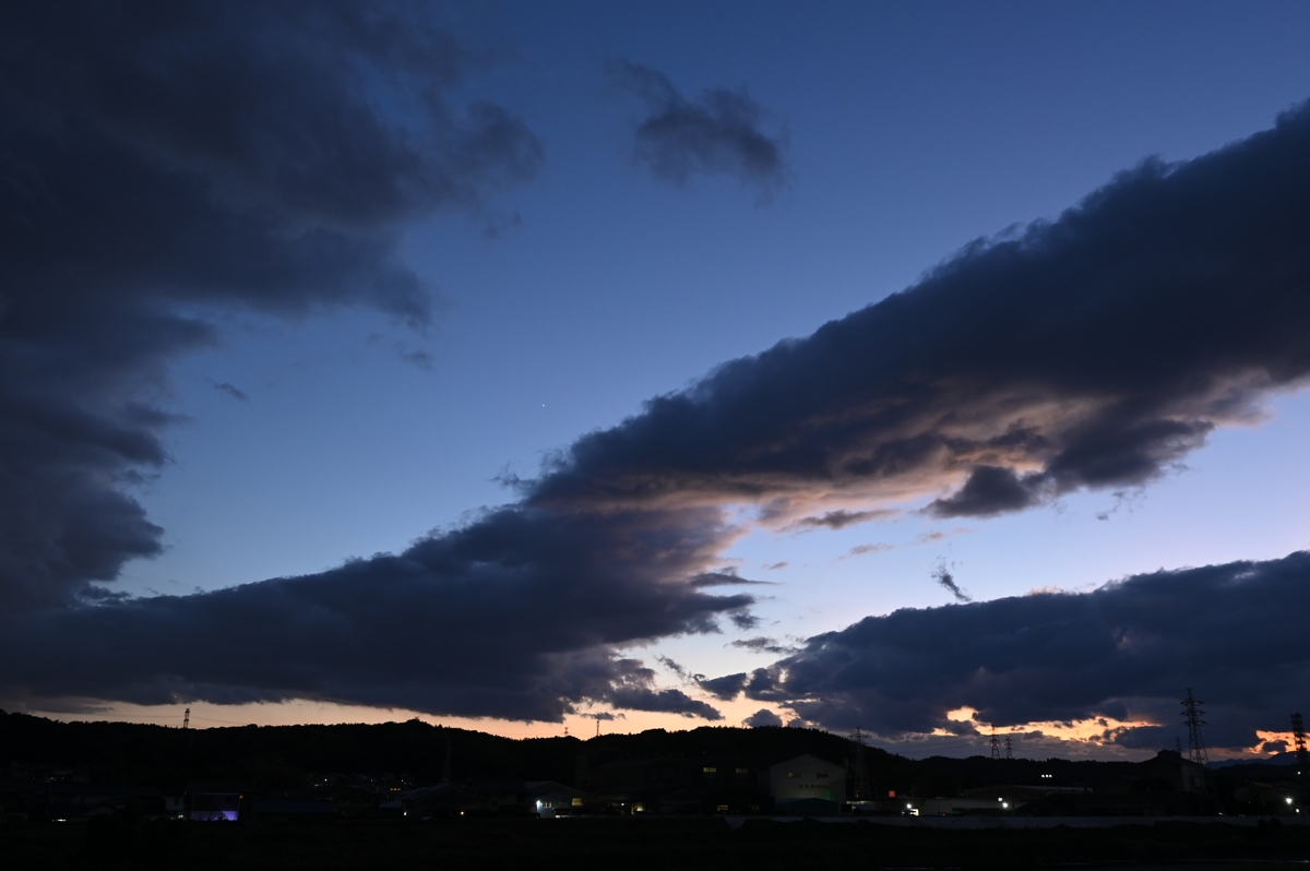 低気圧が東に去りましたが、地上での気圧傾度は強まらず、 風もおだやか。少し上空では北西風が強まったようで、 つるし雲や、つるし雲の性質を帯びた冬らしい長い積雲列。 伊吹山方面のつるし雲は1時間以上美しい形を継続しました。 |