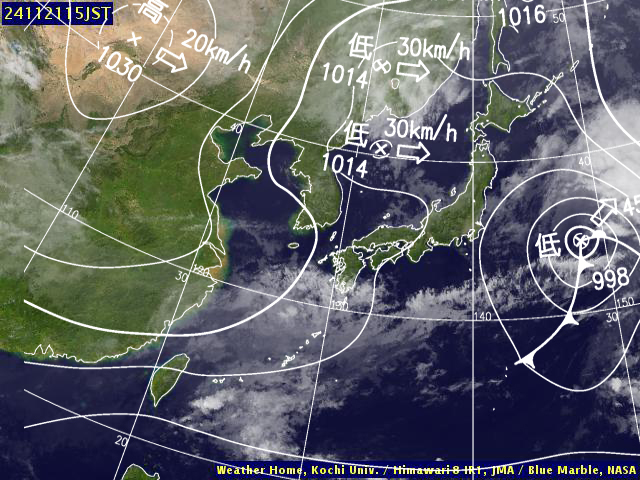 | 地上(高知大学気象情報頁赤外画像と気象庁速報天気図を合成) | |||