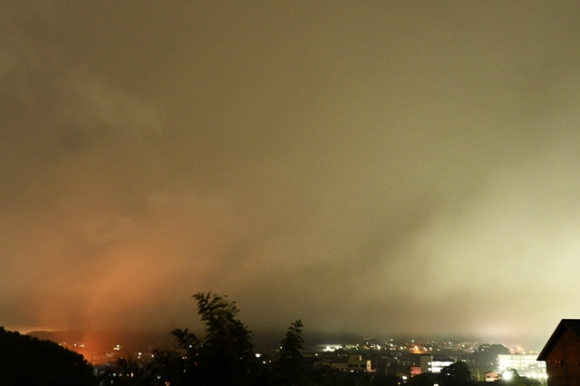 日本海と南岸の二つ玉低気圧。 午後に雨が降り始め、夜には南岸の低気圧の中心付近が通過。 前1時間雨量は、19時に21.5mm、20時に10.0mm、21時に17.5mm。 写真は桑名丘陵の南の低地に降る雨が東風で流されているようす。 町明かりに照らされながら、シャワーのように町に雨が降る光景です。 |