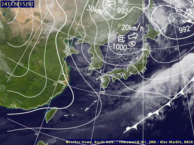 | 地上(高知大学気象情報頁赤外画像と気象庁速報天気図を合成) | |||