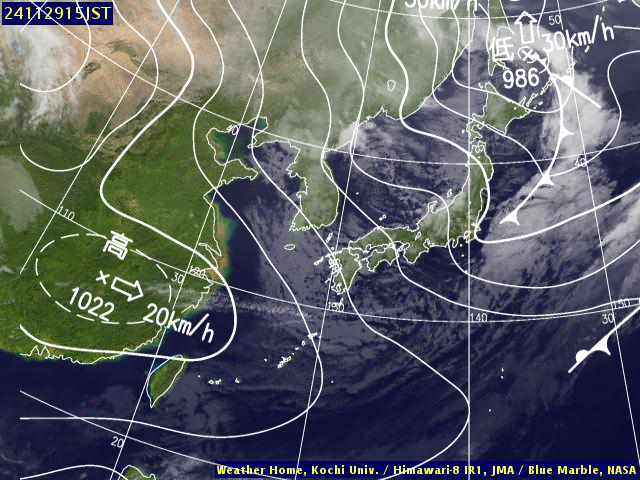 | 地上(高知大学気象情報頁赤外画像と気象庁速報天気図を合成) | |||