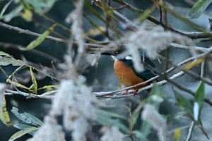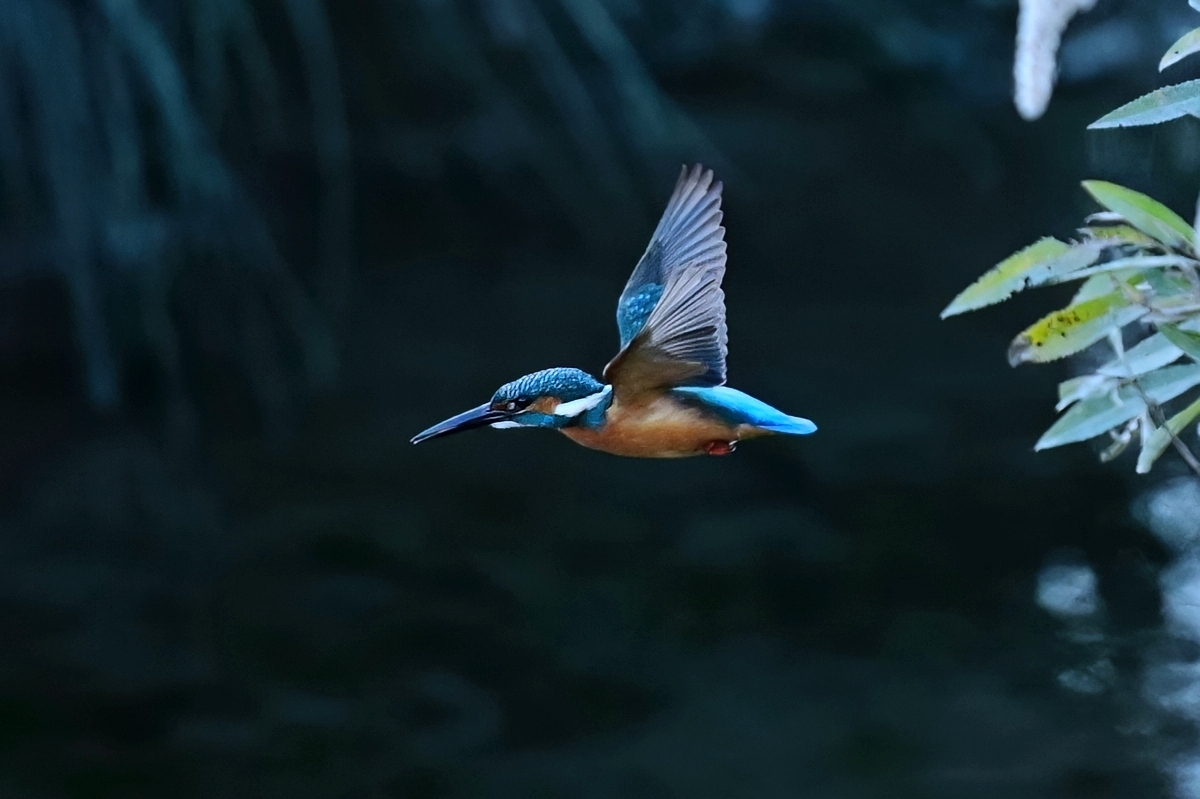 | 午前、揖斐川にはキンクロハジロらしき水鳥の群れ。 風が強く、ほとんど頭部をねじって背中につけ、顔の 見えない状態がほとんど。顔の見えた個体を撮影。 夕方の員弁川。 太陽は厚い雲に隠された、明るめの曇り空。 カワセミが飛来したものの、樹木の見えにくい部分に留まりました。 暗いので、姿がよく見えていれば遅いシャッター速度を選択する つもりでしたが、隠れているので思い切って飛び立って樹木から 離れるところを狙い、1/3000秒に。 すると、すぐに飛び立った ところで、まずまず会心の一発撮り、となりました。欲をいえば、 もう1段ほどでも明るい状況がよかったけれど・・・・・・・ 暗い背景に浮かび上がるカワセミの色彩が綺麗でした。 |
