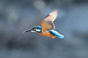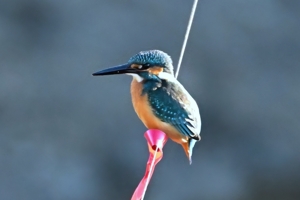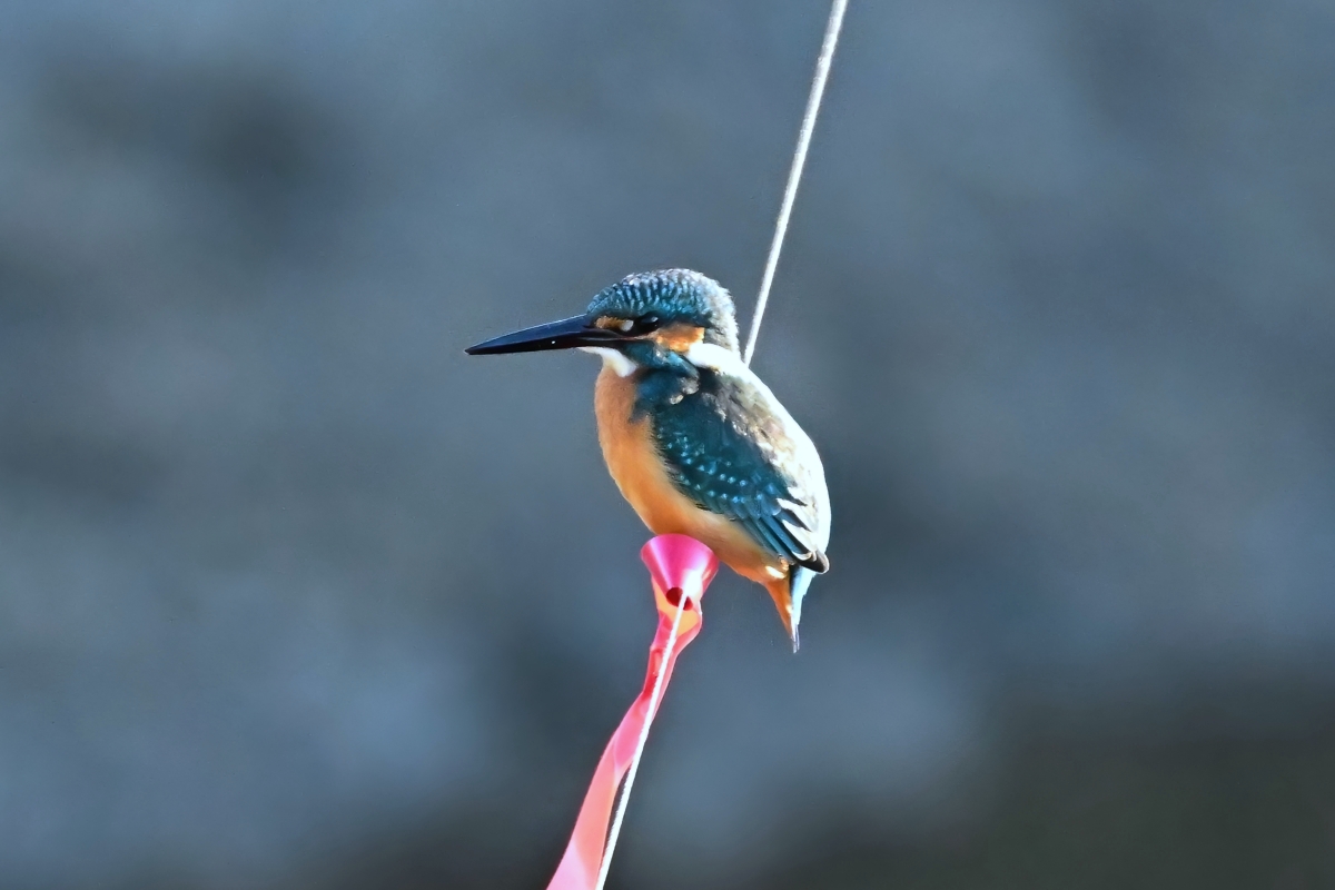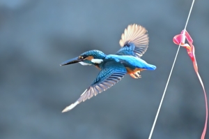 | 夕方の員弁川。謎のロープが張られてずいぶん経ちますが ロープにピンク色のリボンがつけられており、これも謎・・・。 カワセミがこのロープに留まるのは2回目で、ここからの 飛翔を撮影しました。いったん斜め上方に飛んで水平飛翔に なったあと、鉛直下方に向いて水面へ飛び込みました。 飛び込みまで追うことができませんでしたが、高い位置で 陽があたっており、半逆光のおかげで喉・首の白い毛や 手前側の青い翼を美しくとらえることができました。 |