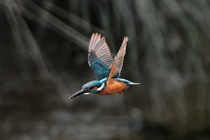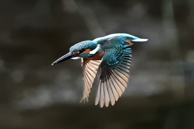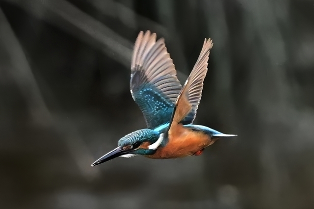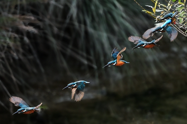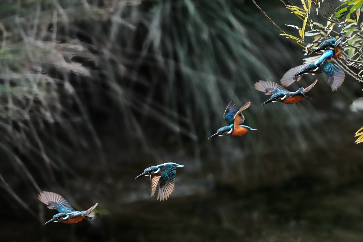 | 夕方の員弁川。 撮影場所から少し距離のある樹木を拠点にして、カワセミが何度も 水面に飛び込みました。何度目かにようやく、見える場所からの 飛び込みがあって、30コマ/秒で連射。フォーカスはようやく使い 慣れてきた3Dトラッキング。ほとんどのカットで合焦できていたので、 3コマごと、すなわち0.1秒の等時間間隔で合成をしてみました。 日没後には約16mの場所に来て、魚を捕らえましたが、 これはもう暗すぎて動きは撮れませんでした。 |