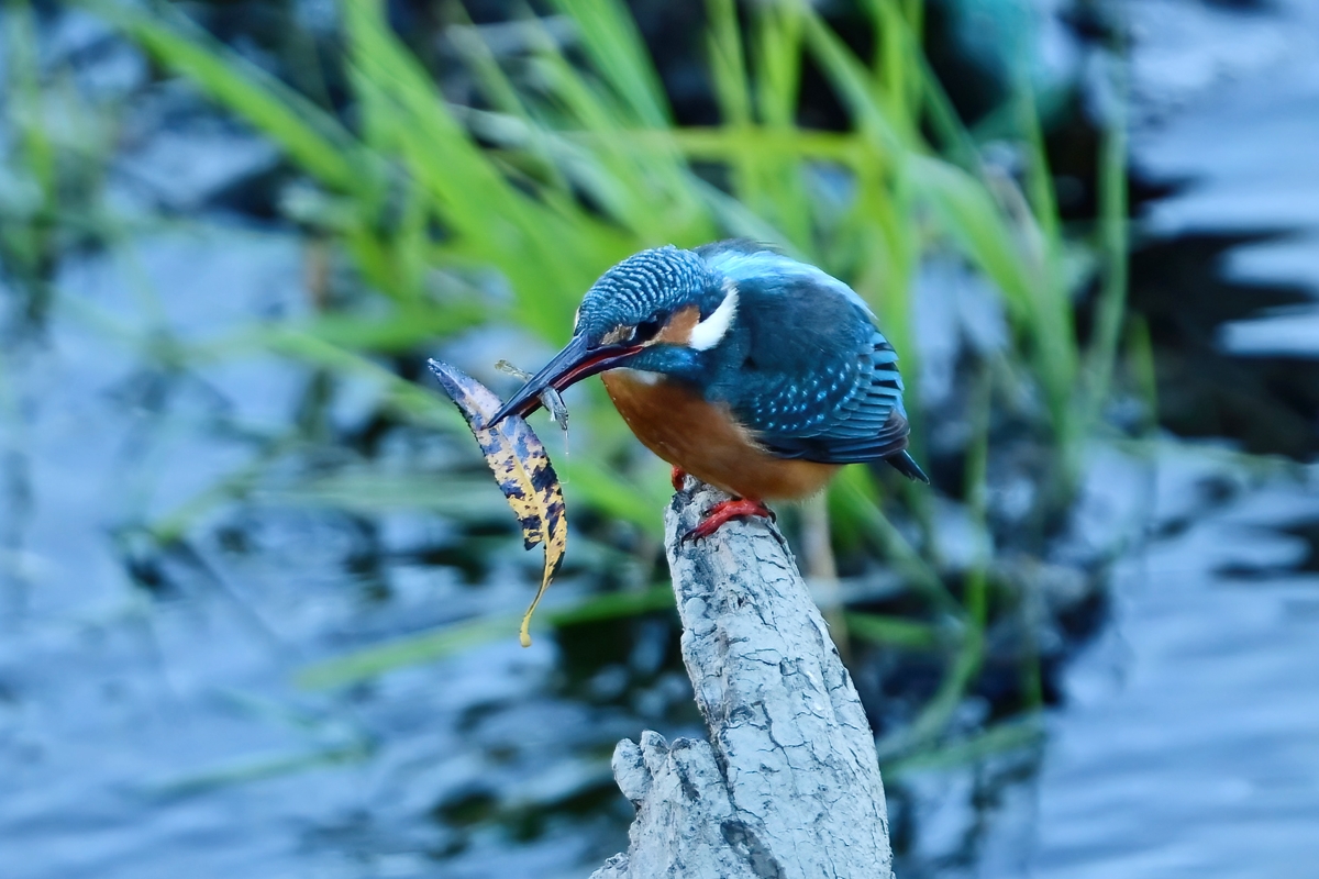 厚い雲に日差しを阻まれた、午後の員弁川。 早い時間帯にカワセミが登場(15時10分)。 飛び込みから浮上飛翔を20コマ/秒で連写しました。 飛び込んだ場所は、手前岸の枯草が前ボケとして少し重なっ てしまったのが少し残念ですが、3Dトラッキングがよくはたら いていて、一連の動きがよくとらえられていると思います。 16時ころに2度目の登場をしたカワセミは、すでに飛び込んで から飛んできたもので、枯れ葉とエビをくわえており、枯れ葉 だけをうまく落として、エビを食べていました。食べ終えて少し 落ち着いたところの留まり姿をじっくり撮り、撮影終了しました。 |