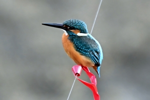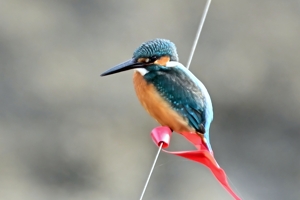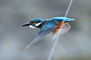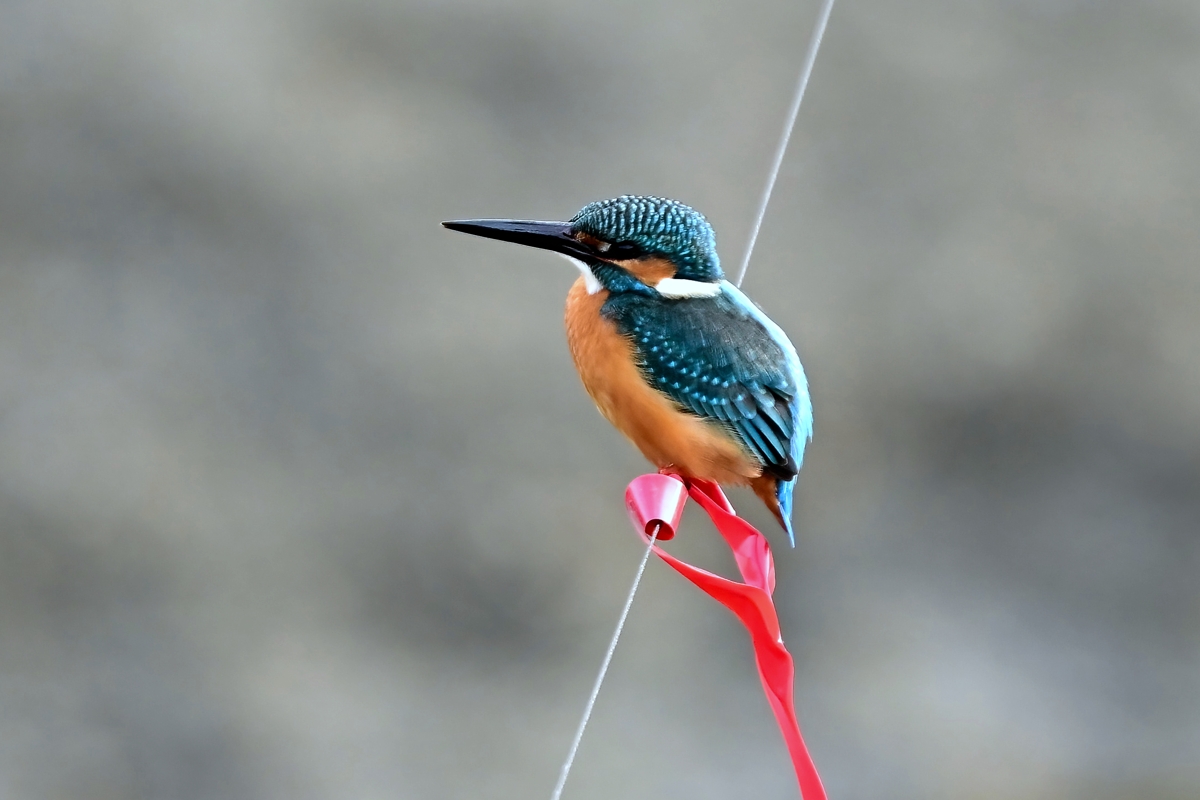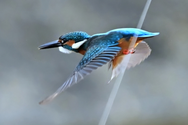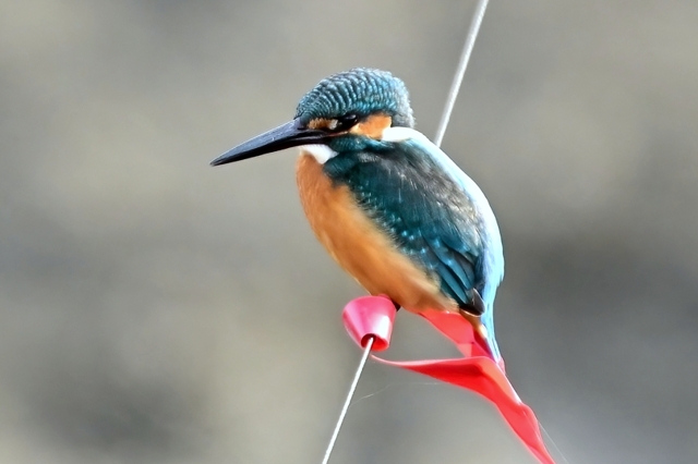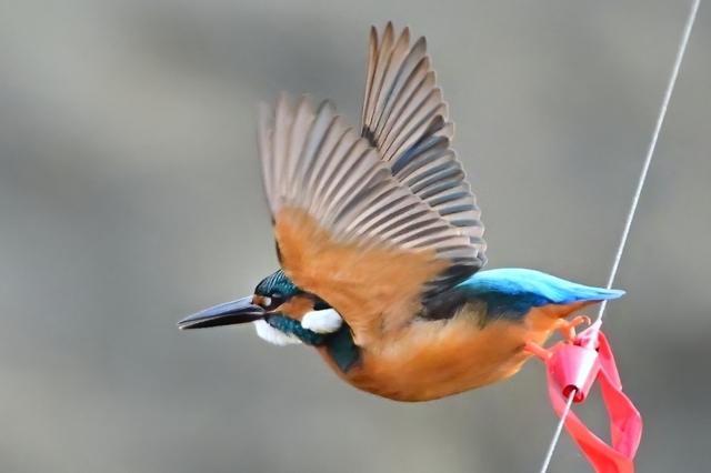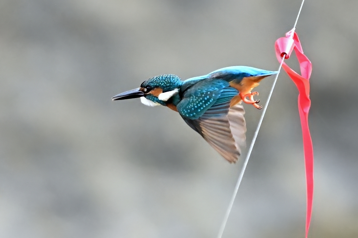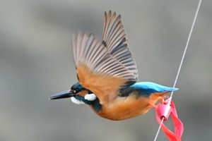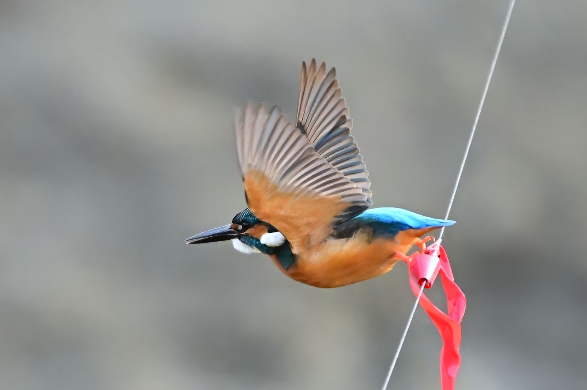 | 夕方の員弁川。 15時台の早い時間帯にあらわれるようになったカワセミです。 川に張られた謎の細い糸に赤いリボンが目印につけられており、 そのリボンの位置にカワセミがよく留まります。まるでカワセミの ための目印のようになっています。そこからの飛び立ちを撮影。 巻層雲を通した薄日射す光線状態。カワセミに関係ないですが、 飛立ち後に振動を始める糸は1/3000秒でも大きくぶれています。 |