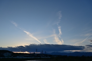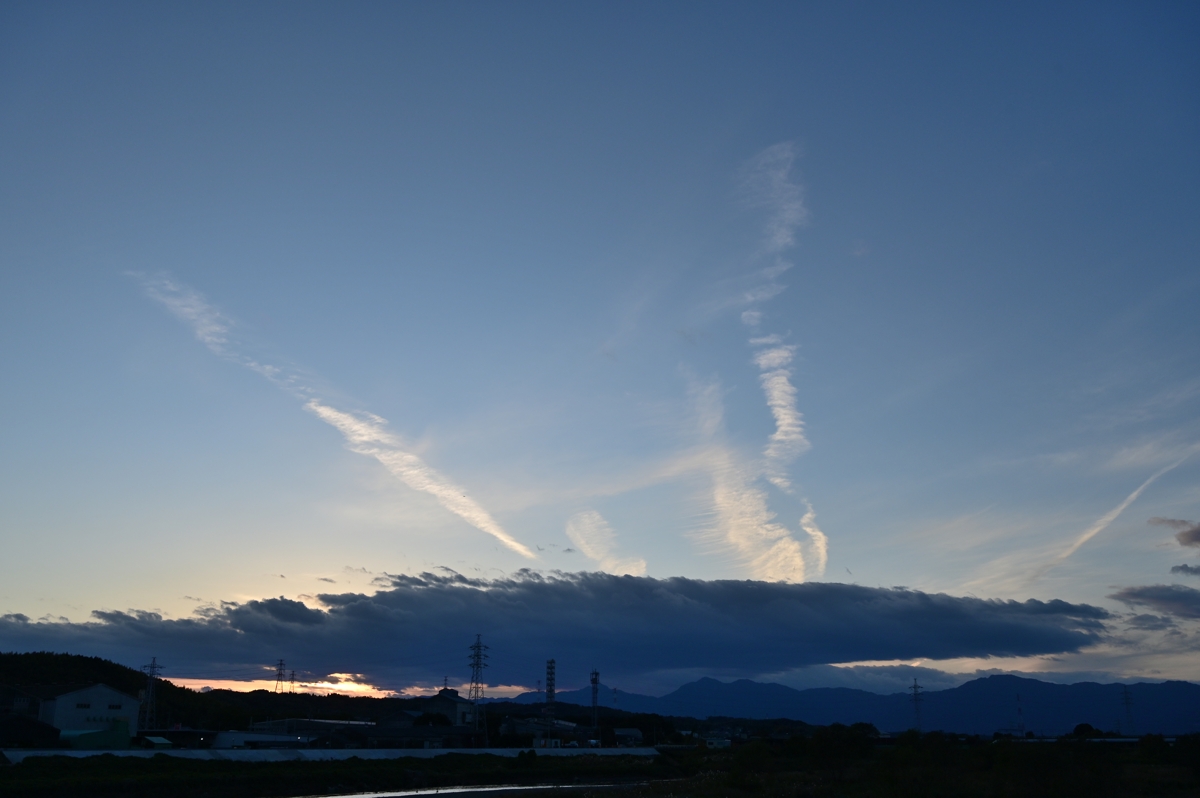 | ゆるやかな西高東低の気圧配置が継続しており、きびしくは ない寒さではあるものの、本格的な冬に近づいている気配。 鈴鹿山脈からは家の庇のように平野部にかけて広がる層積雲。 また、山脈から離れたところにも層構造をもつ細長い層積雲。 こうした雲が迫力ある姿となった昼頃には突風気味の強い風が 吹き付けていましたが、夕方には雲が消えるとともに弱まりました。 |