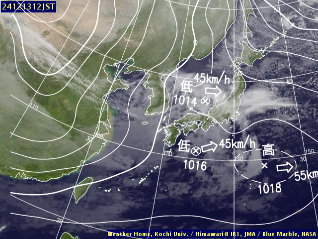 | 地上(高知大学気象情報頁赤外画像と気象庁速報天気図を合成) | |||