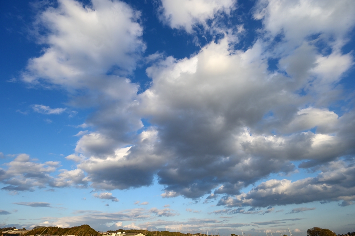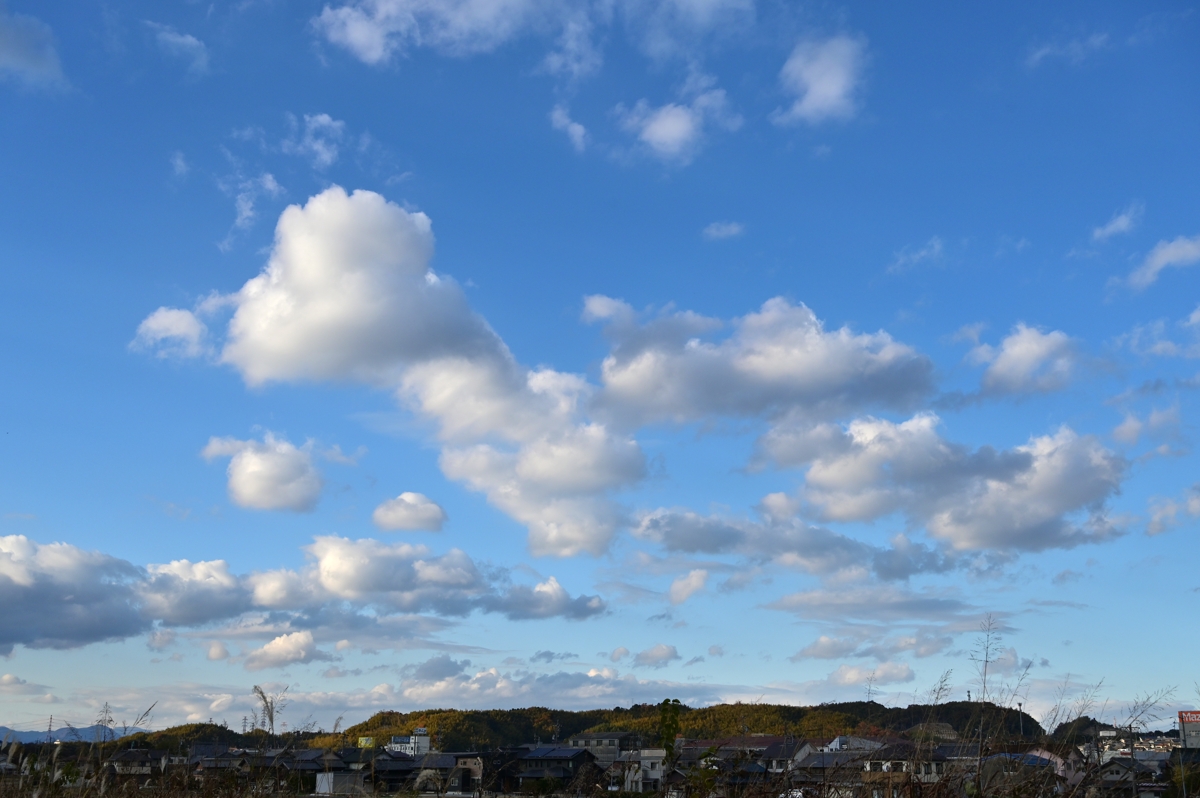西高東低気圧配置の等圧線の間隔が広くなり、少し寒気の流入が 弱まった空では、昨日までの毛羽立ったような輪郭をもつ赤緯雲は 減って、丸みを帯びた輪郭の積雲がゆっくりと流れていきました。 おだやかな冬の空です。 |