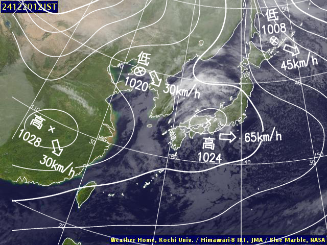 | 地上(高知大学気象情報頁赤外画像と気象庁速報天気図を合成) | |||