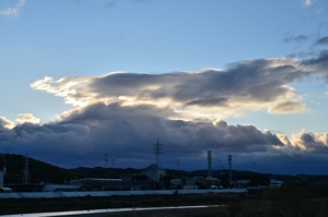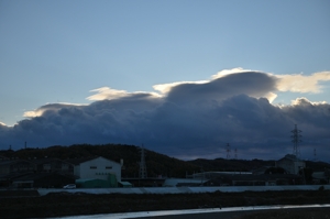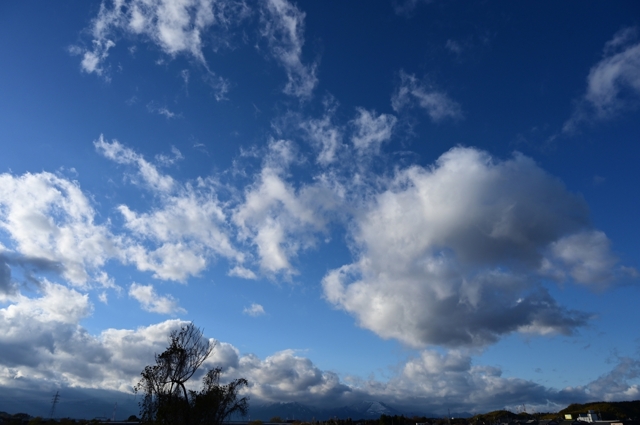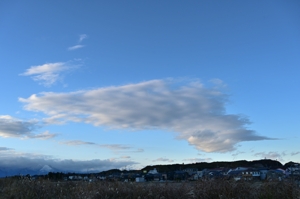 | 冬型h吾ずいぶんと緩みましたが、冷たい季節風が継続。 青空にゆったりと積雲が流れていて、平野部で蒸発が 進み、断片雲になっていく空。山脈の上や山麓には、冬ら しい2層重ねの地形性の雲が頻繁に発生していました。 |