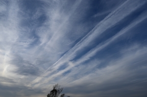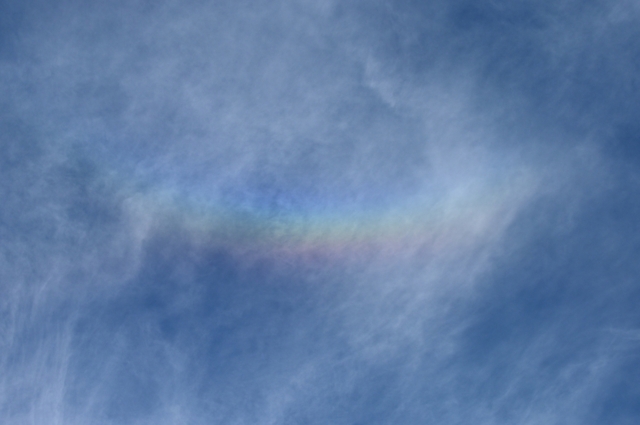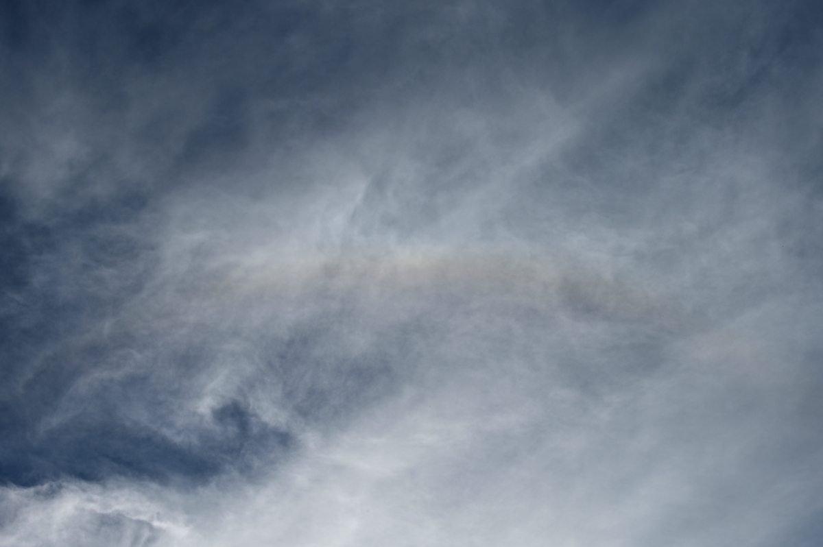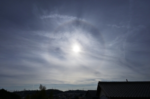| 昼前ころから、流れてくる巻雲や巻層雲がおおい続ける空。 22°ハロ、タンジェントアーク、幻日、環天頂アークが見られ ました。なかでも幻日は午後のあいだじゅう、断続的に明滅 するようにあらわれ続けました。衛星画像では北緯36〜38° 付近にCiストリークやトランスバースラインが長く見られていて、 これらのジェット気流に伴う上層雲の空が続いたようです。 |