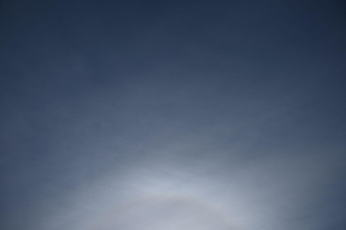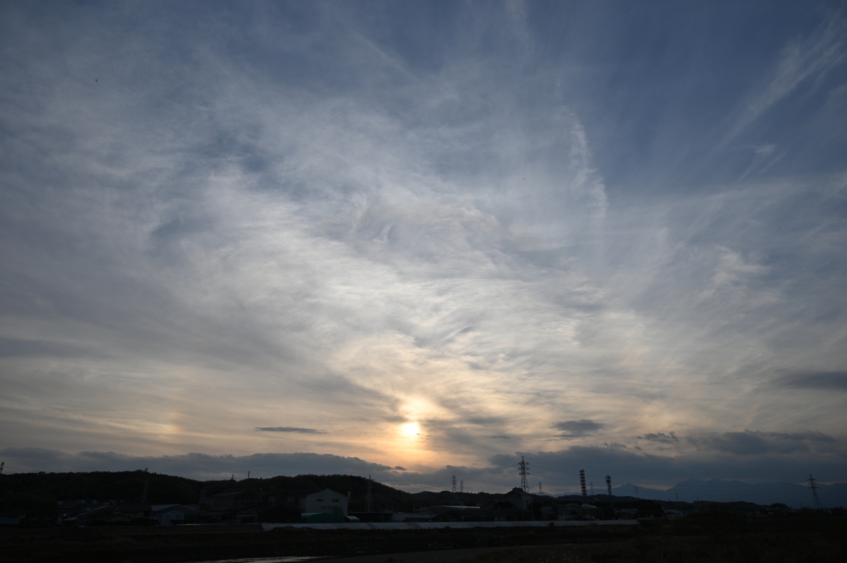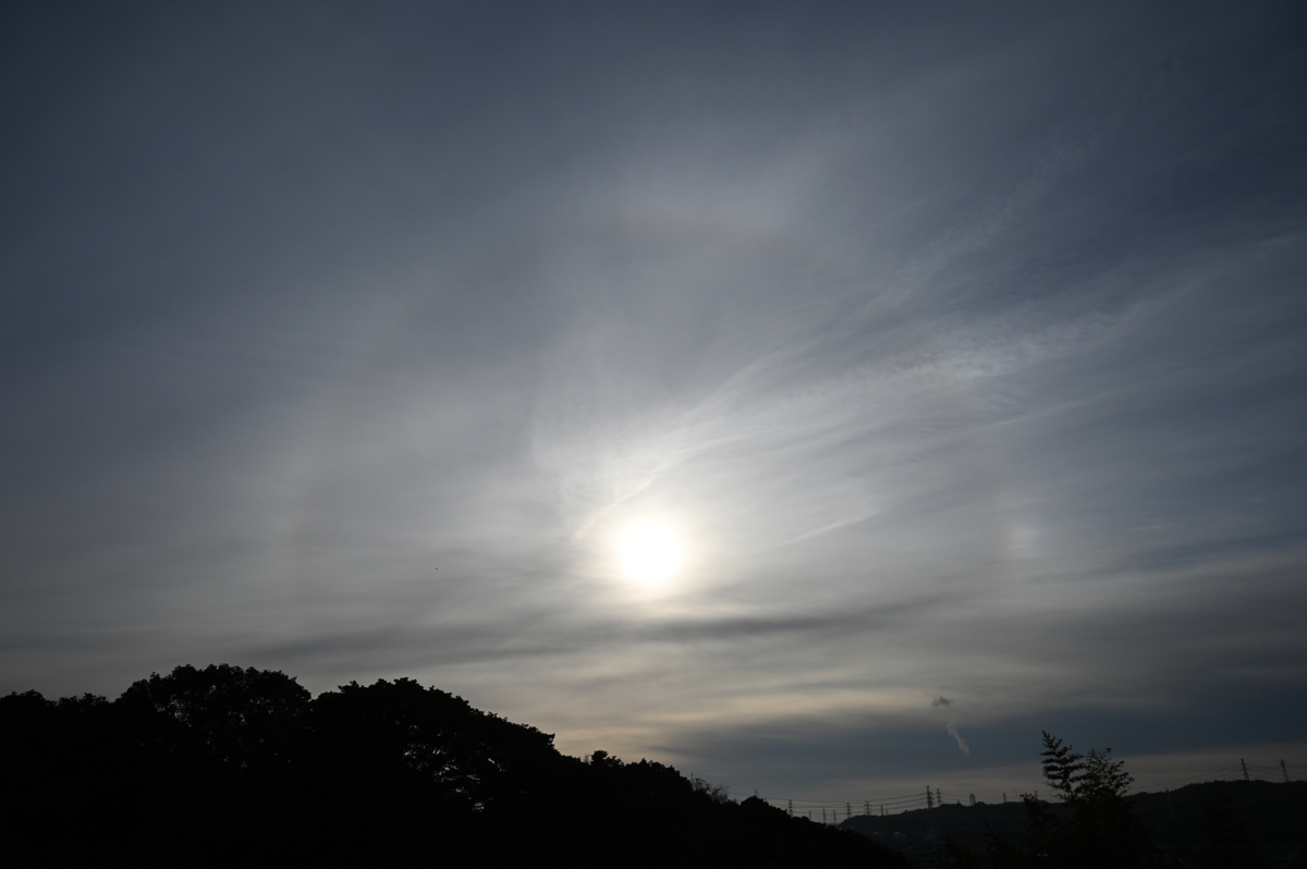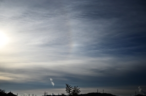 最低気温が0.9℃と冷え込んだ朝。じわじわと寒くなっている印象です。 南に高気圧の中心、北に低気圧があり、おもに巻層雲に覆われた空。 日中はあまりハロが無かったものの、朝夕に、22°ハロ・幻日・タンジェ ントアークが出現しました。ごく淡い環天頂アークも見えたりもしました。 |