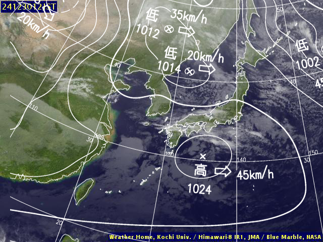 | 地上(高知大学気象情報頁赤外画像と気象庁速報天気図を合成) | |||