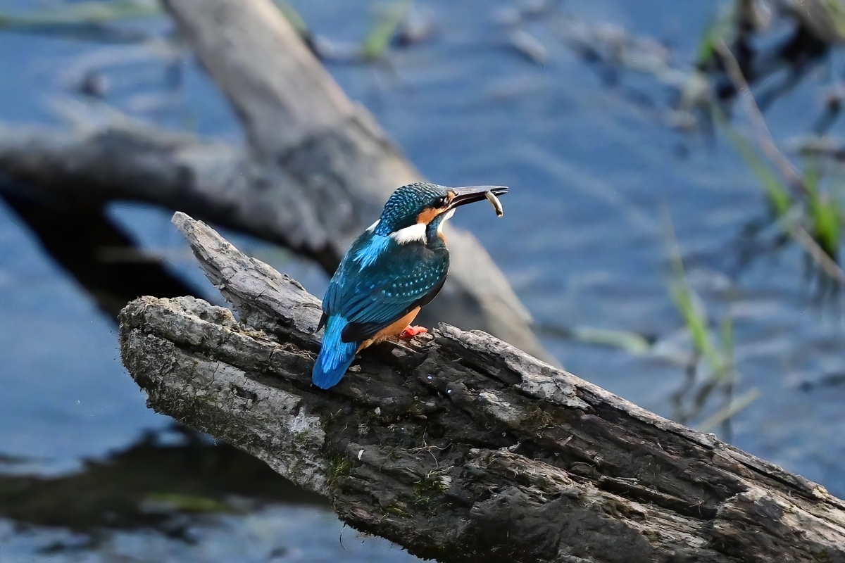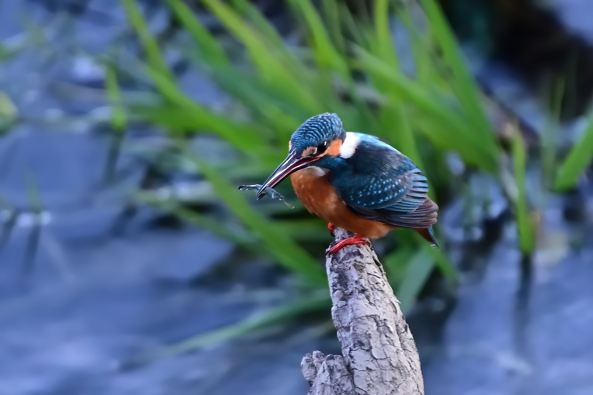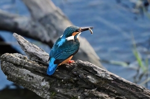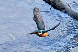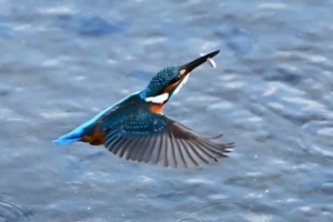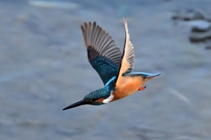 | 冷たい西風が強く吹く、夕方の員弁川。 日没前の16時33分にカワセミが登場。右手の手袋を外してシャッターを 押しましたが、あっという間に手がかじかんできました。新しい手袋ですが 指先カット加工が必要。 かろうじて明るさがあったので、シャッター速度 1/3000秒で飛び込みなどの活動を撮影しました。 日没後にふたたび 戻ってきて飛び込みをしましたが、エビを捕獲した姿を1/6秒のスロー シャッター連写するのみ。被写体ブレのないカットをセレクトしました。 |