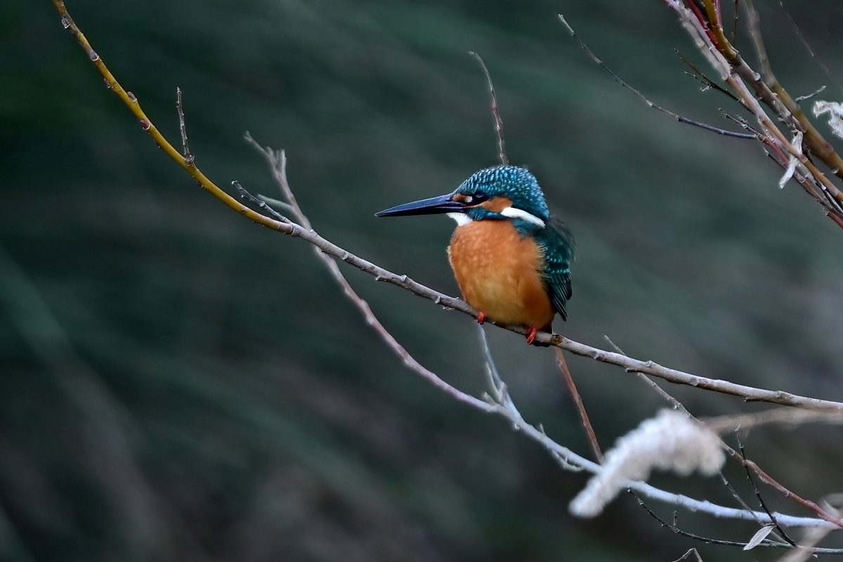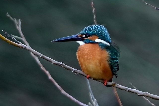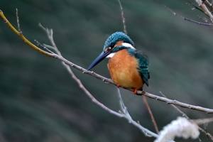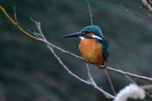 | 寒気が流入してきて冷たい強風の吹く、夕方の員弁川。 16時過ぎにカワセミがあらわれて、手前岸の見えないところや 樹木の陰になるところで、しきりに飛び込みなどの活動。 16時20分、ようやく見えるところに留まったカワセミは、雲から ほんのわずかに漏れる陽光を受けて、とても美しい色合いです。 強風(画面の右奥から)を受けて羽毛がまきあげられています。 |