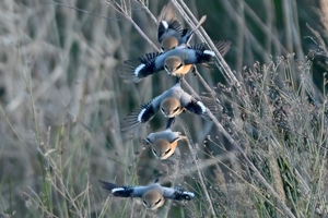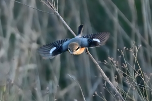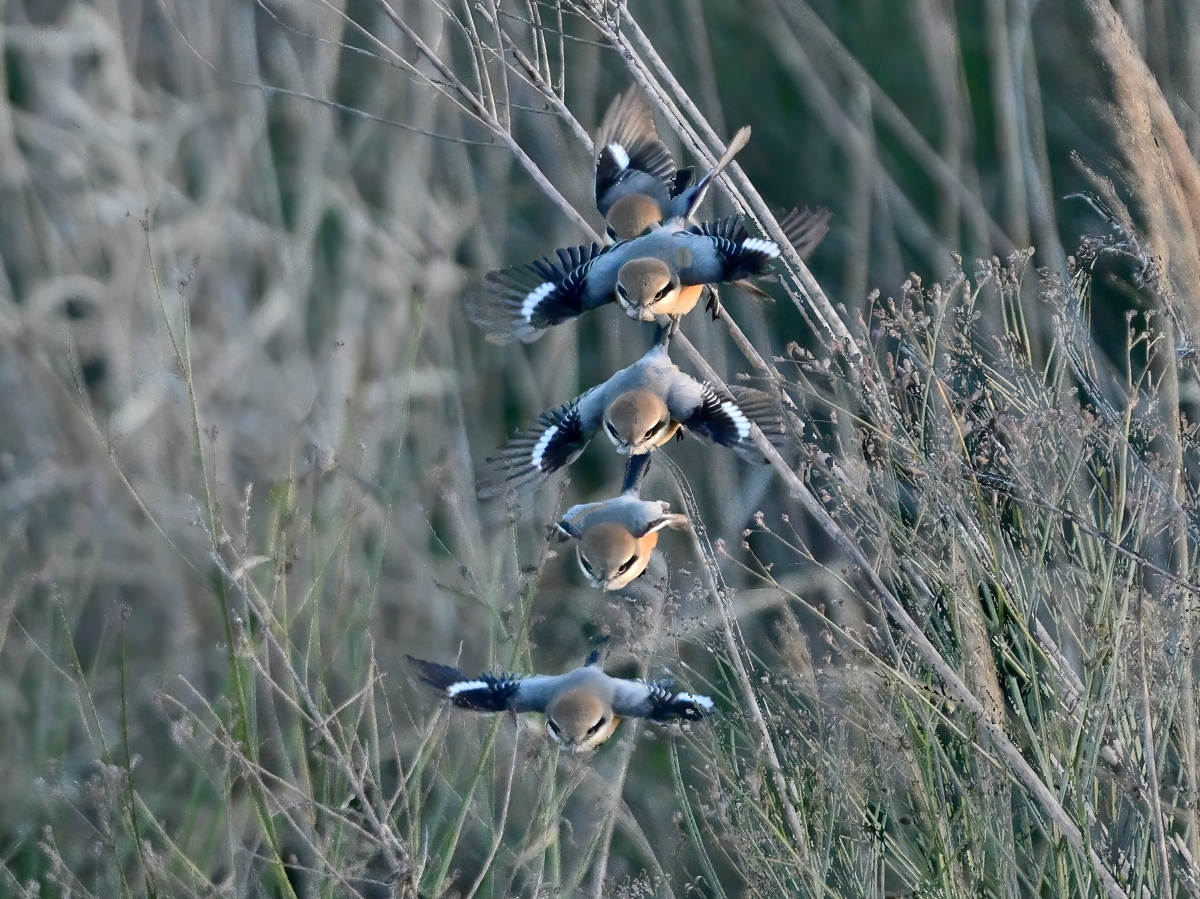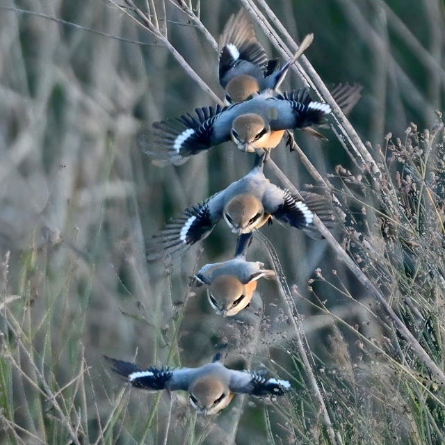 | f2.8 1/3000秒 ISO2200 | モズ(オス) 手前下方へ飛翔(合成) 双眼鏡観察しながらリモコンシャッター |