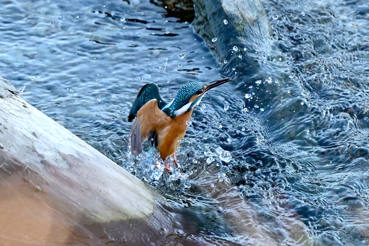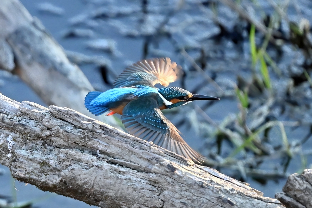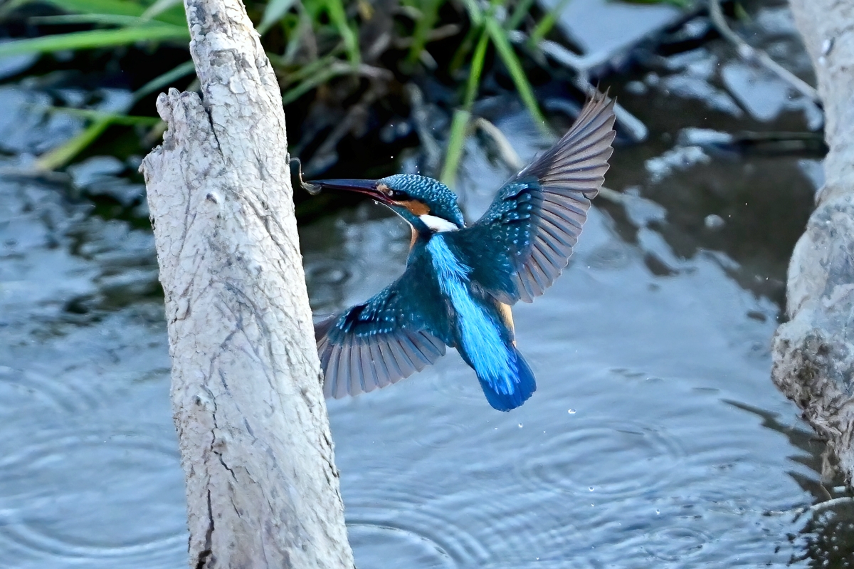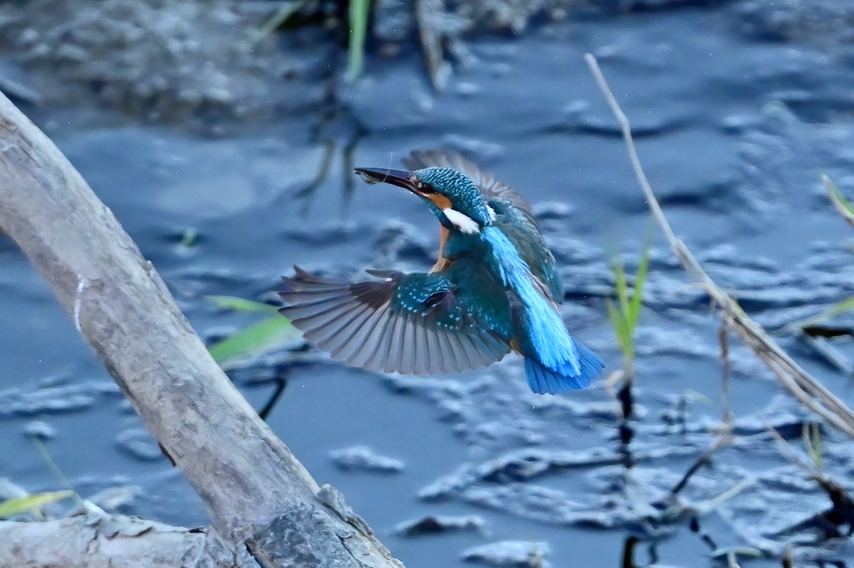 | カワセミ | 倒木の向こう側を飛翔。枝を移る。 | ||