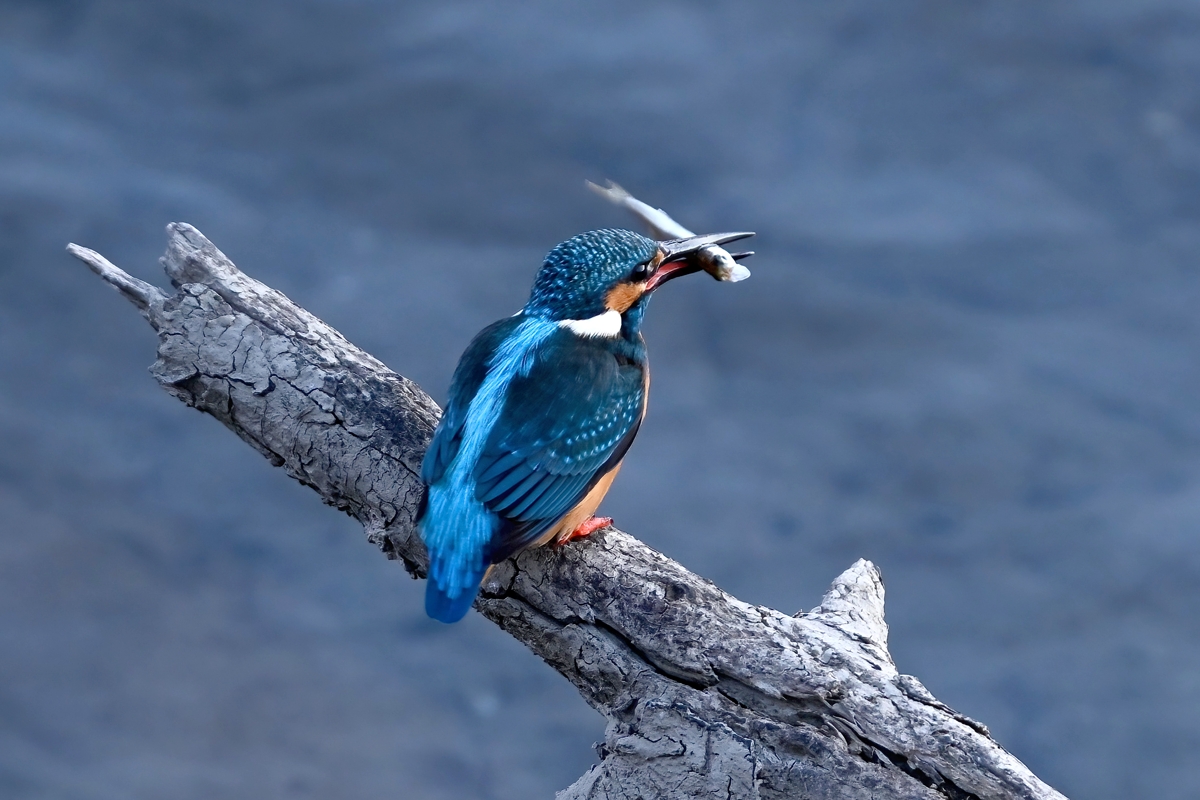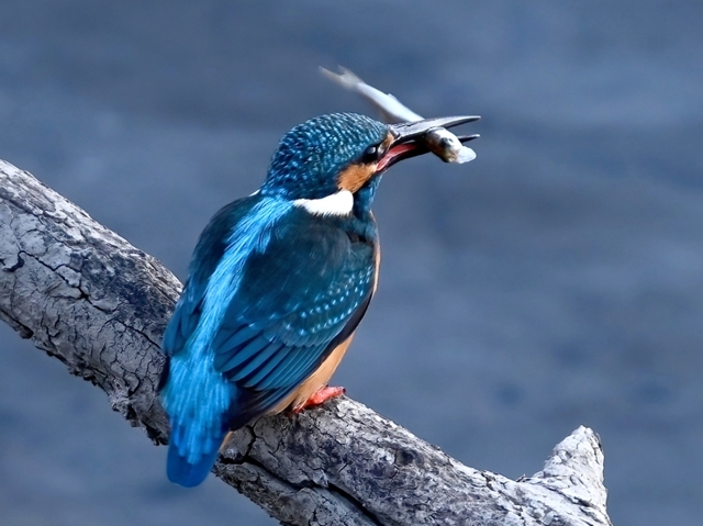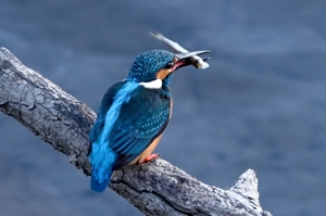 夕方、雲ひとつない快晴のもと、員弁川にて。 中州の浅瀬にツグミがあらわれたところ、すぐさまモズ(メス)に追われて 飛び去っていしまいました。モズがますます攻撃的になっているようです。 これではカワセミもあらわれにくいかと思いましたが、日没の30分ほど前に 倒木付近にやって来ました。水面に数回飛び込みをして、中には浮上飛翔で 大きく向きを転回するシーンが印象的でした。体操選手の捻り技のようです。 日没後、暗くなってからも再びあらわれ、少し大きめの魚を捕獲しました。 |