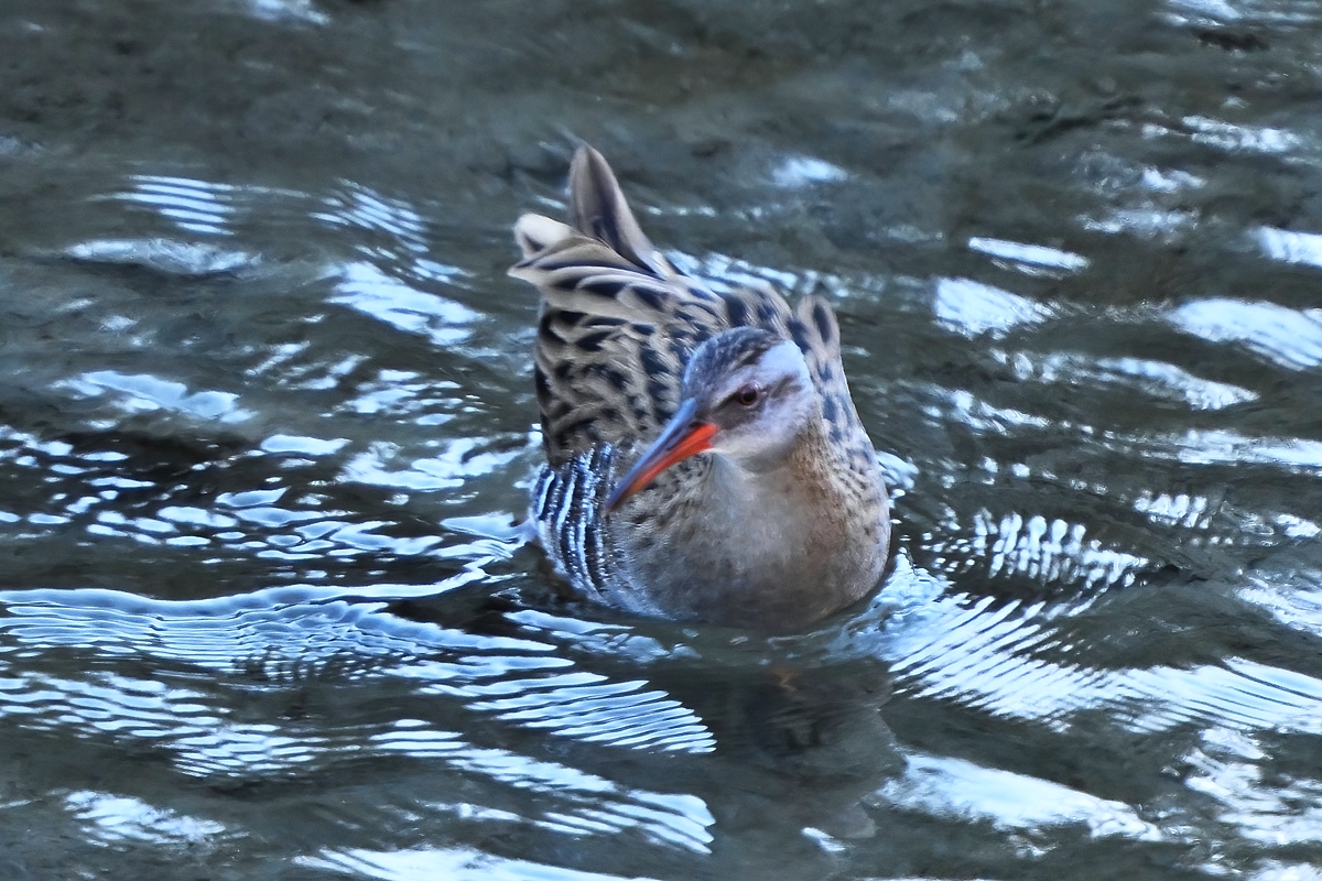 夕方の員弁川にて。 クイナがこの場所で今季5度目の目撃。見える場所にかなり長い時間いて、 何度も水浴びを繰り返しました。クイナの、歩く・走る・泳ぐ、といったシーン を見慣れてくると、いつか「飛ぶ」シーンを見たいという思いが強まって来ま すが、本当に飛ぶのかどうか疑わしくなるほど飛ぶことが少ないようです。 カワセミは15時前から日没後までの間に5回やってきました。樹木の陰から 水面に飛び込むシーンばかりで、目の前は飛翔通過するのみ。4回目の 登場でようやく顔の見える、樹木の枝に留まった写真が撮れました。川の 水面から突き出た倒木に留まったのは日没後の5度目の登場時。ここは 1日の最後の食事場所という位置づけになっているようです。(昨日のよう に、明るい時間帯に留まって活発に飛び込むこともあります。) ちなみに、今日のカワセミの登場時刻は、@14:53 A15:47 B16:19 C16:58 D17:35 約40分ごとという感じでした。 モズ(メス)は、今日も浅瀬に来たセグロセキレイ2羽を追い払いました。 モズ(オス)は近くの下流側になわばりをもっと、わりに悠然としています。 今日はほかに、対岸にカイツブリ2羽、キジの飛翔。 双眼鏡(16×56)で観察しました。 |