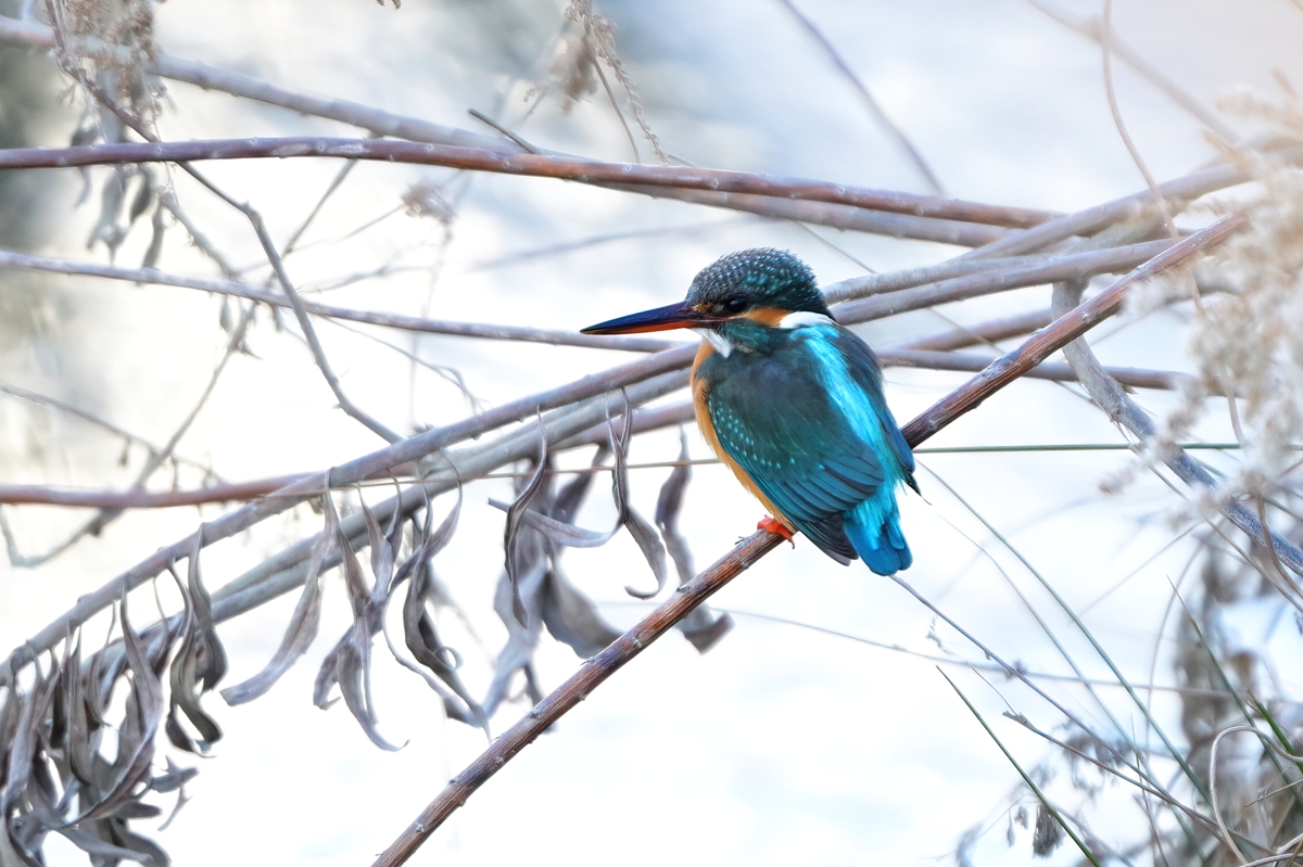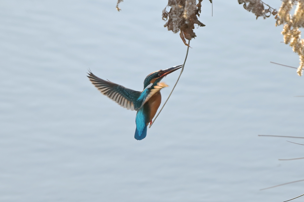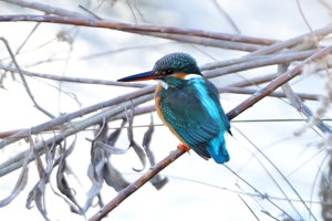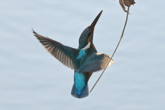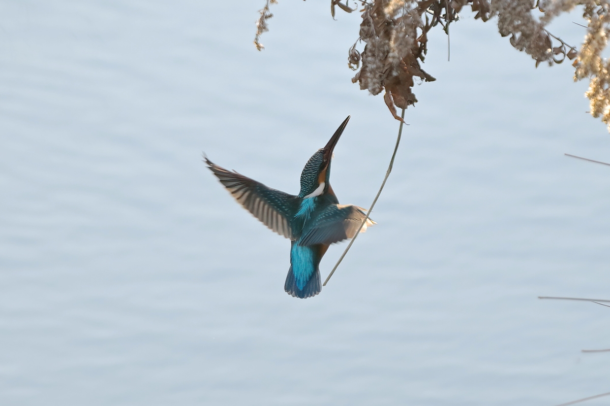 | カワセミ(メス?) 一応メスとするが、強逆光で 下嘴が透けて赤いのかも。 最初にいたのはメスで、オスが接近して メスがオスを追い払うように(?) 両者が遠くへ飛び去った。 |