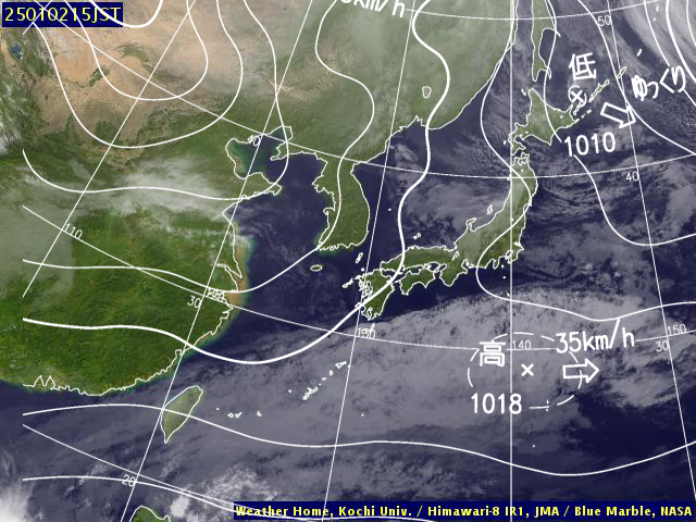| 地上(高知大学気象情報頁赤外画像と気象庁速報天気図を合成) | |||